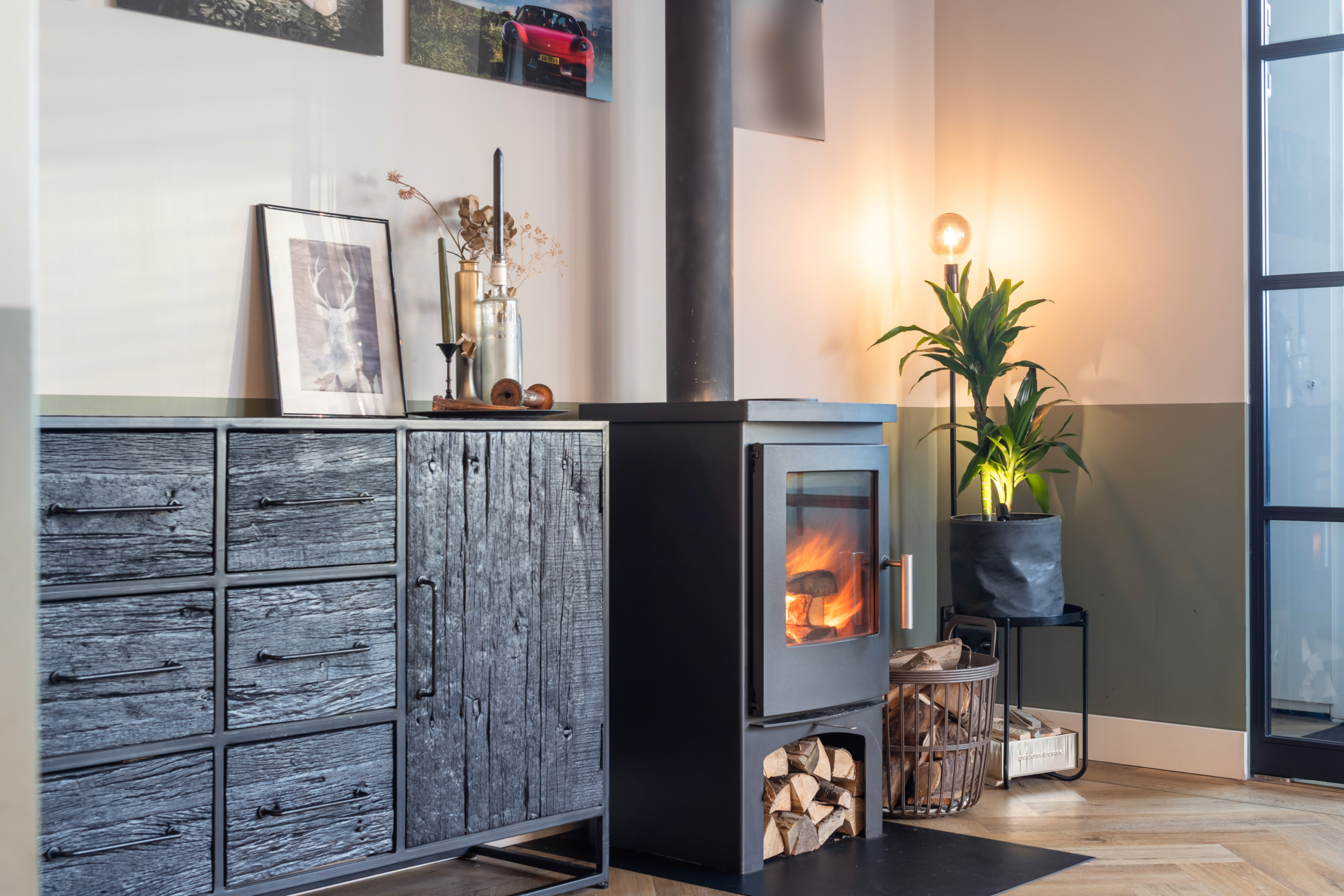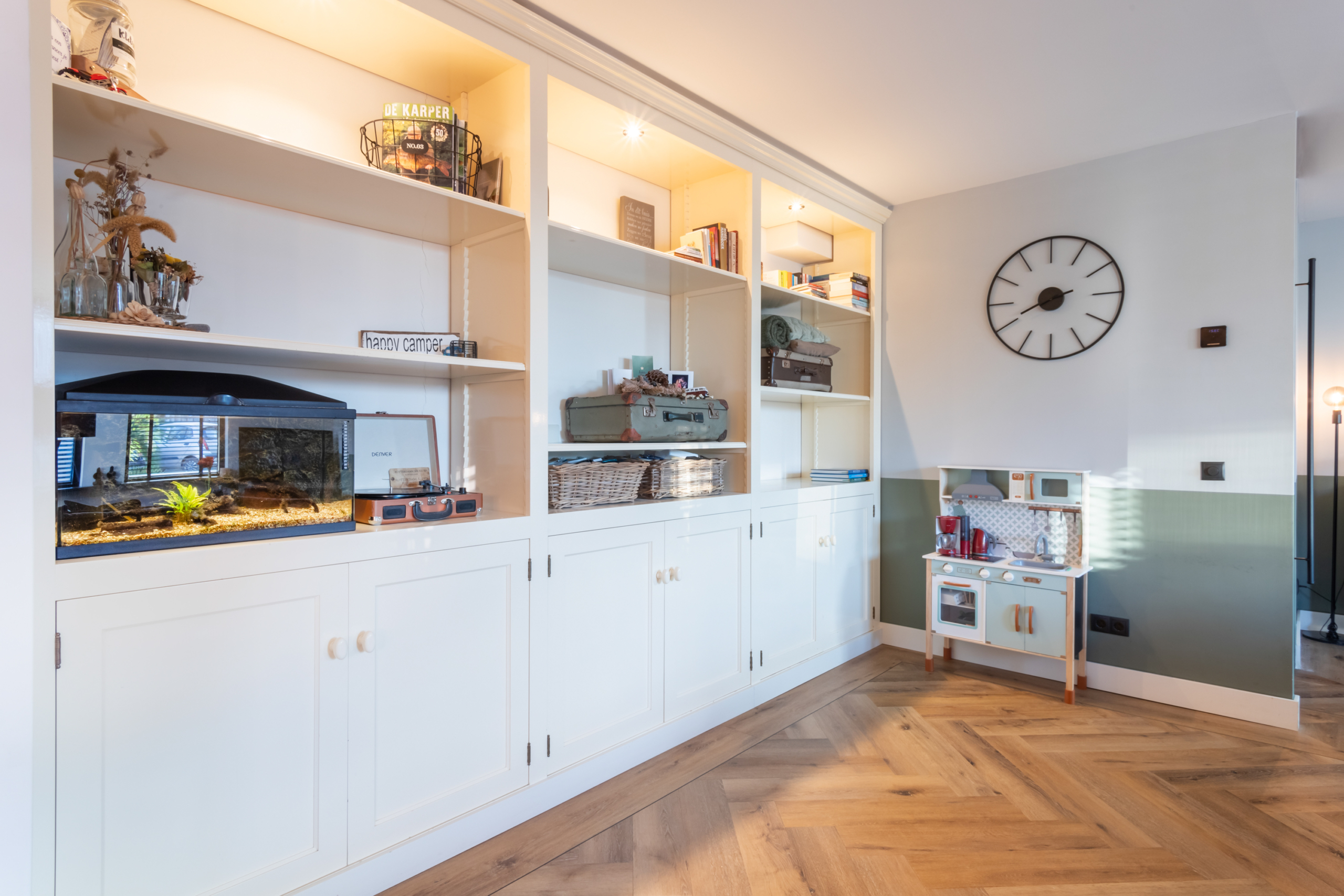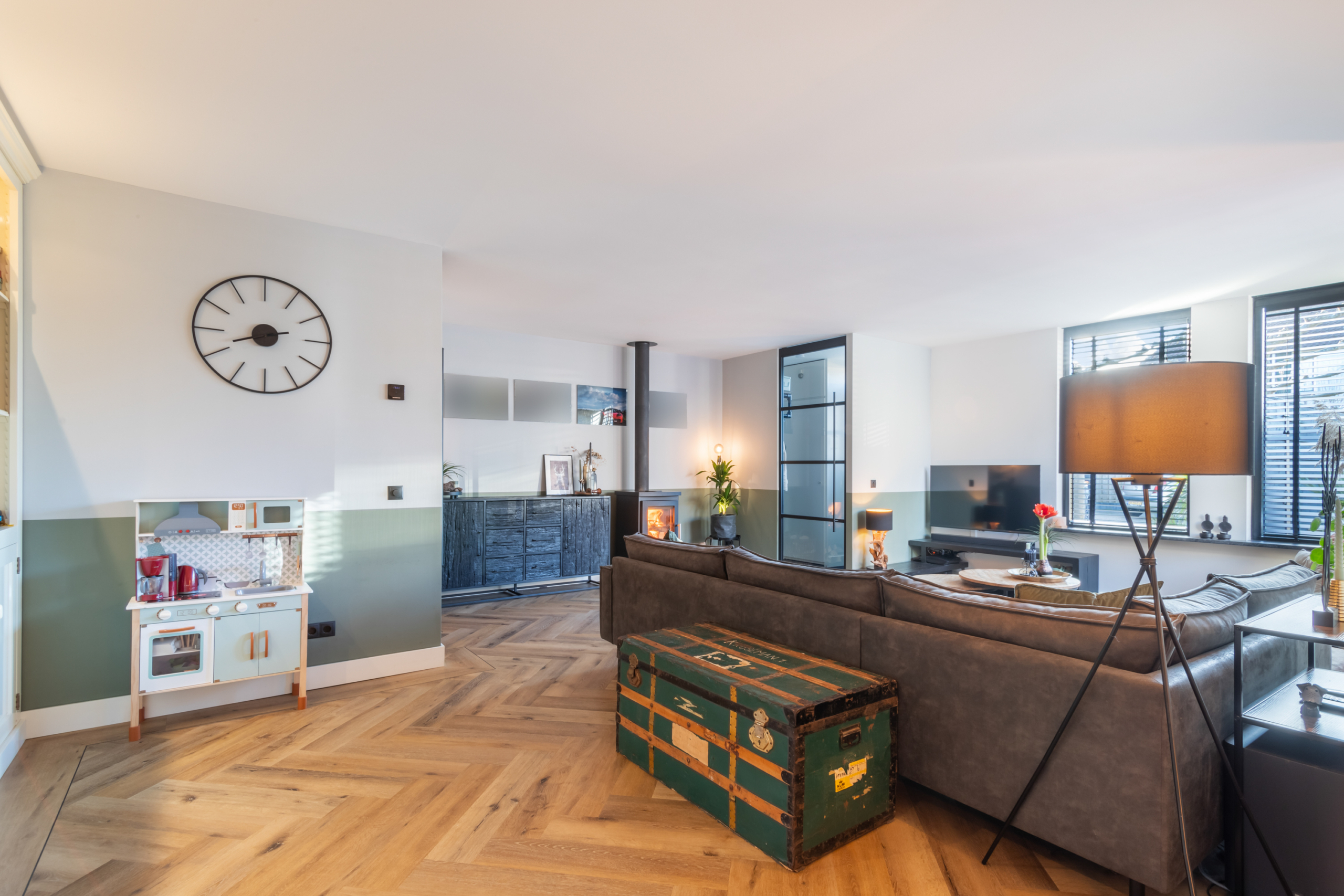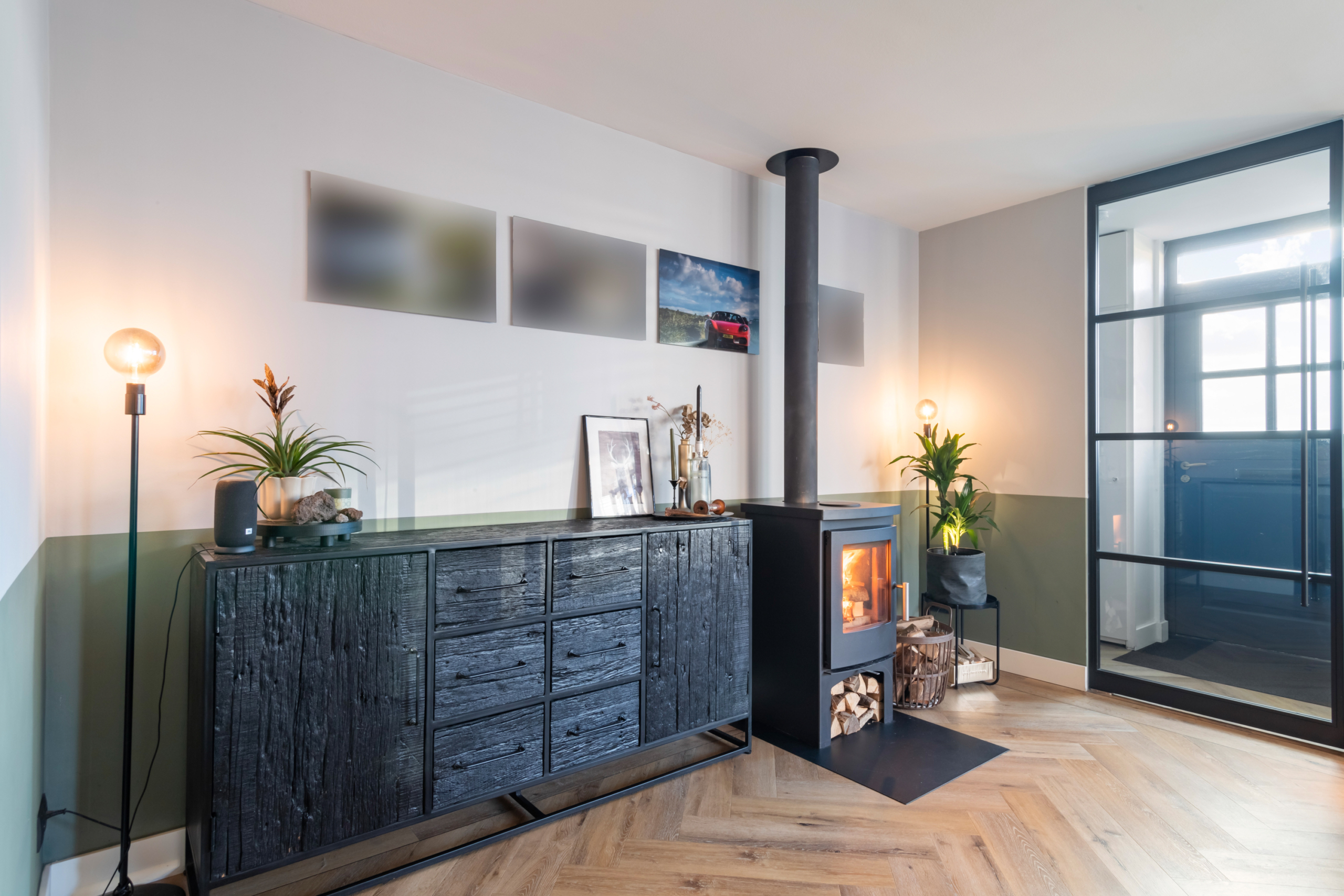 Begane grond – voordeur naar entree met daarin de meterkast welke geheel vernieuwd is in 2025, woonkamer met veel lichtinval door de ramen op het westen gericht. De vloer is voorzien van vloerverwarming en een moderne pvc visgraatvloer. Tevens verwarmd door een hout CV-kachel die ook de CV-leidingen verwarmt. Achterin de woonkamer is een fraaie vaste kastenwand aanwezig die in dezelfde stijl als de keuken is vormgegeven.