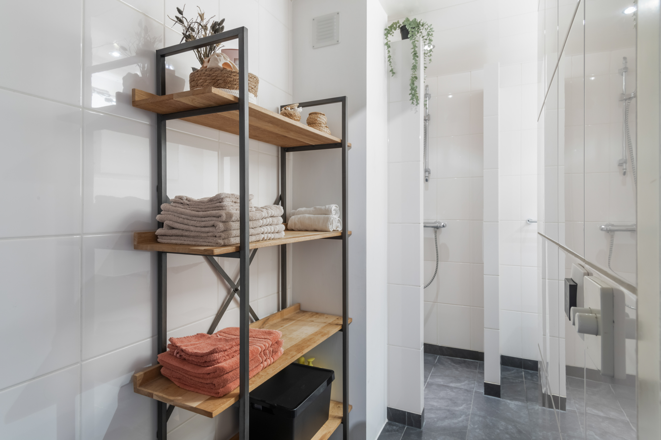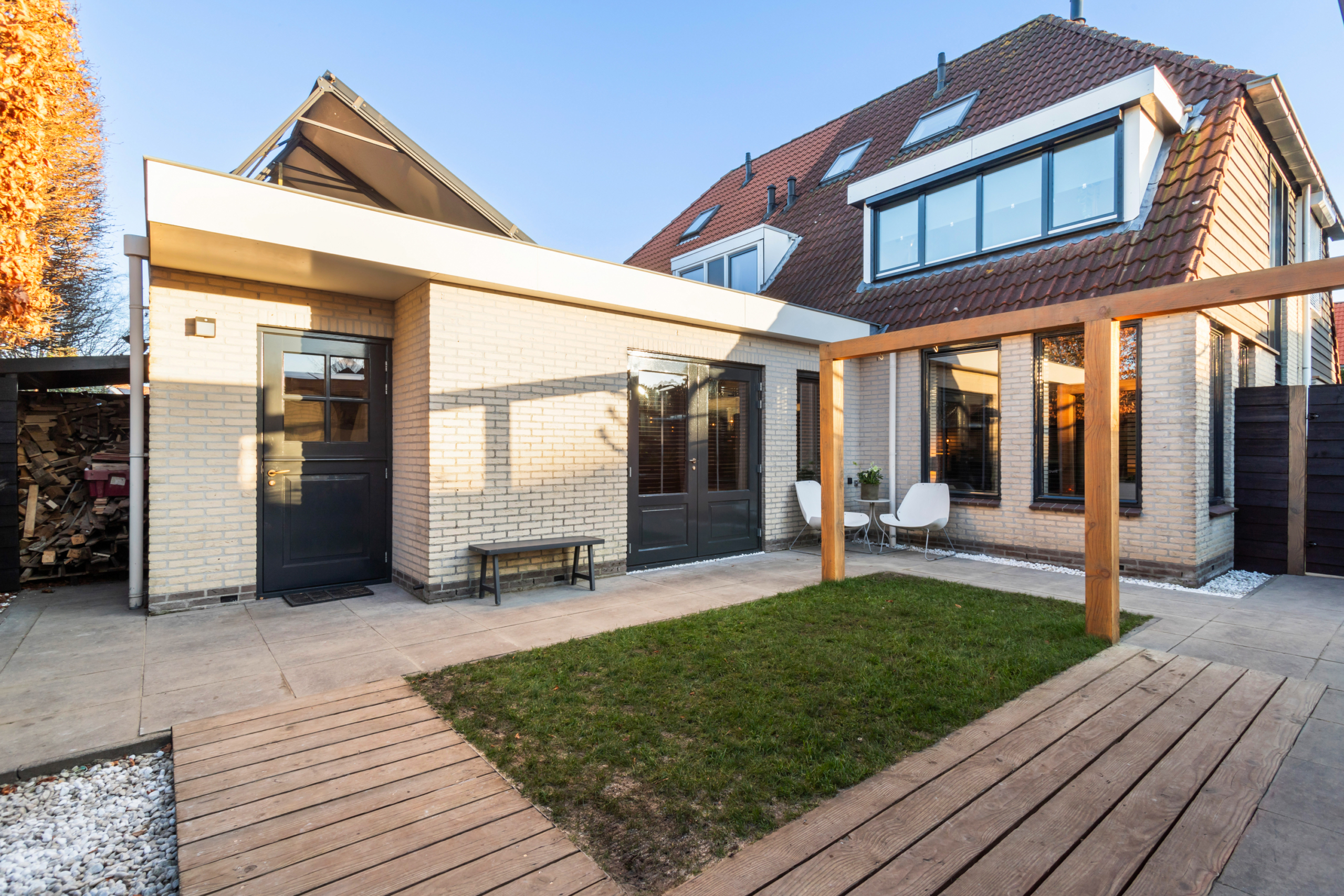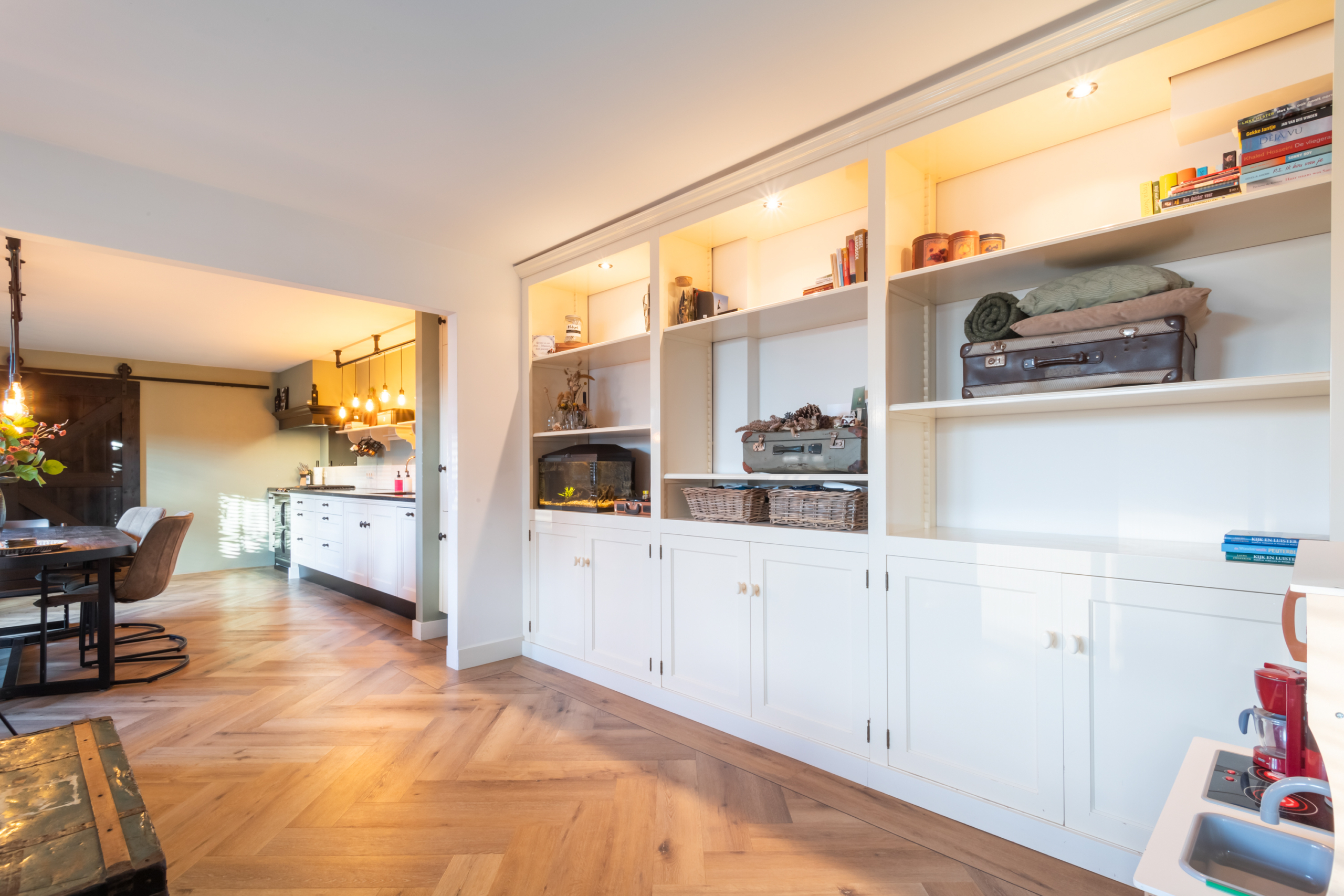 Vanuit de keuken heb je toegang tot de tuin via de openslaande deuren of via de bijkeuken. De bijkeuken is voorzien van ruime bergkasten met schuifdeuren en openslaande deuren alwaar ook de extra vriezer mooi is weggewerkt.