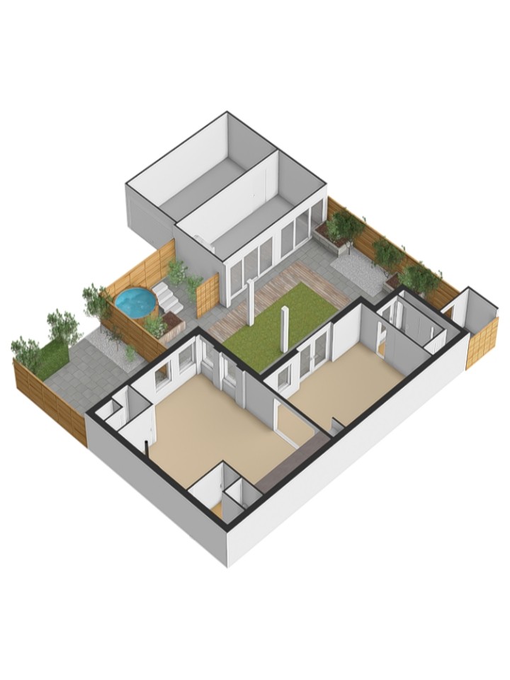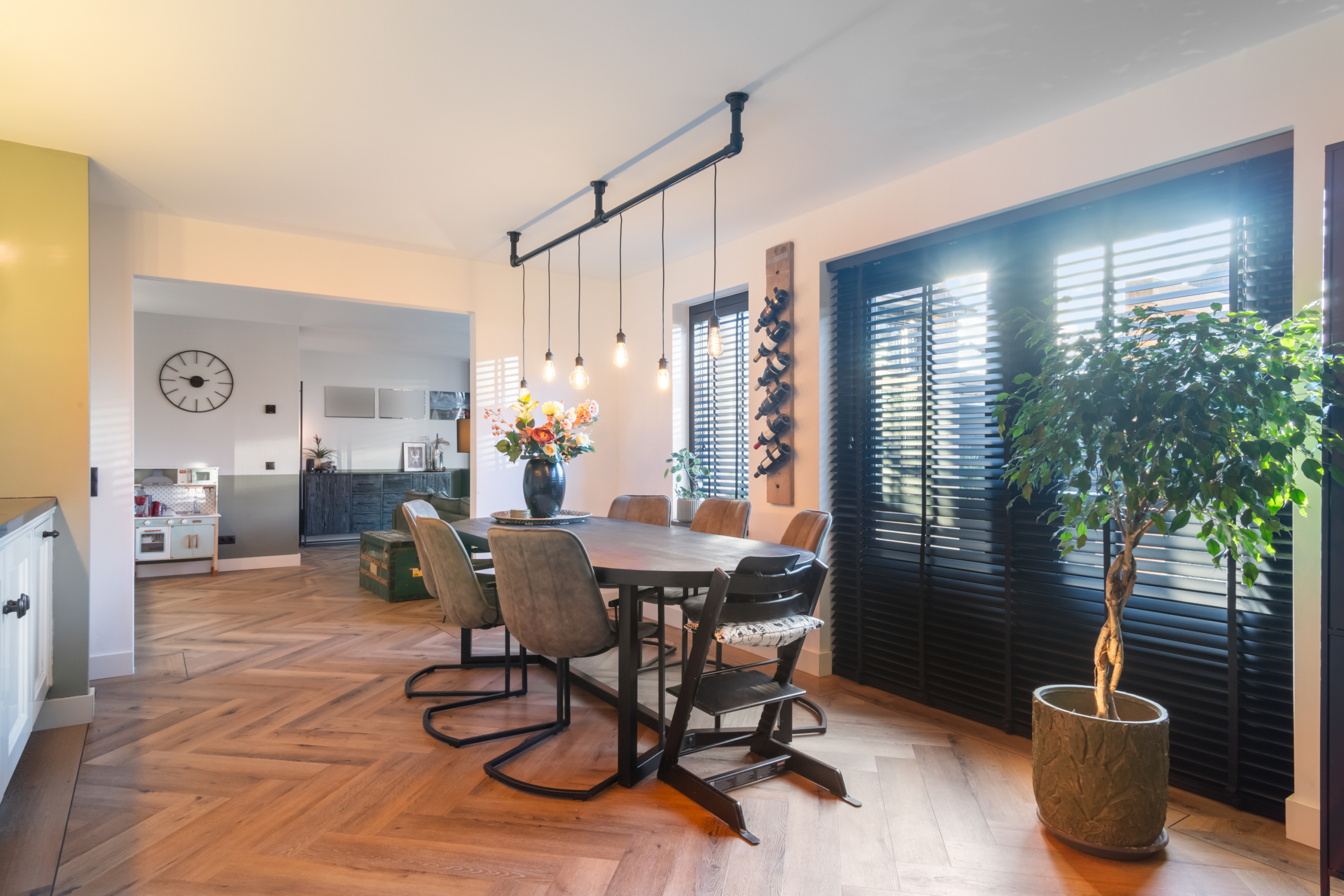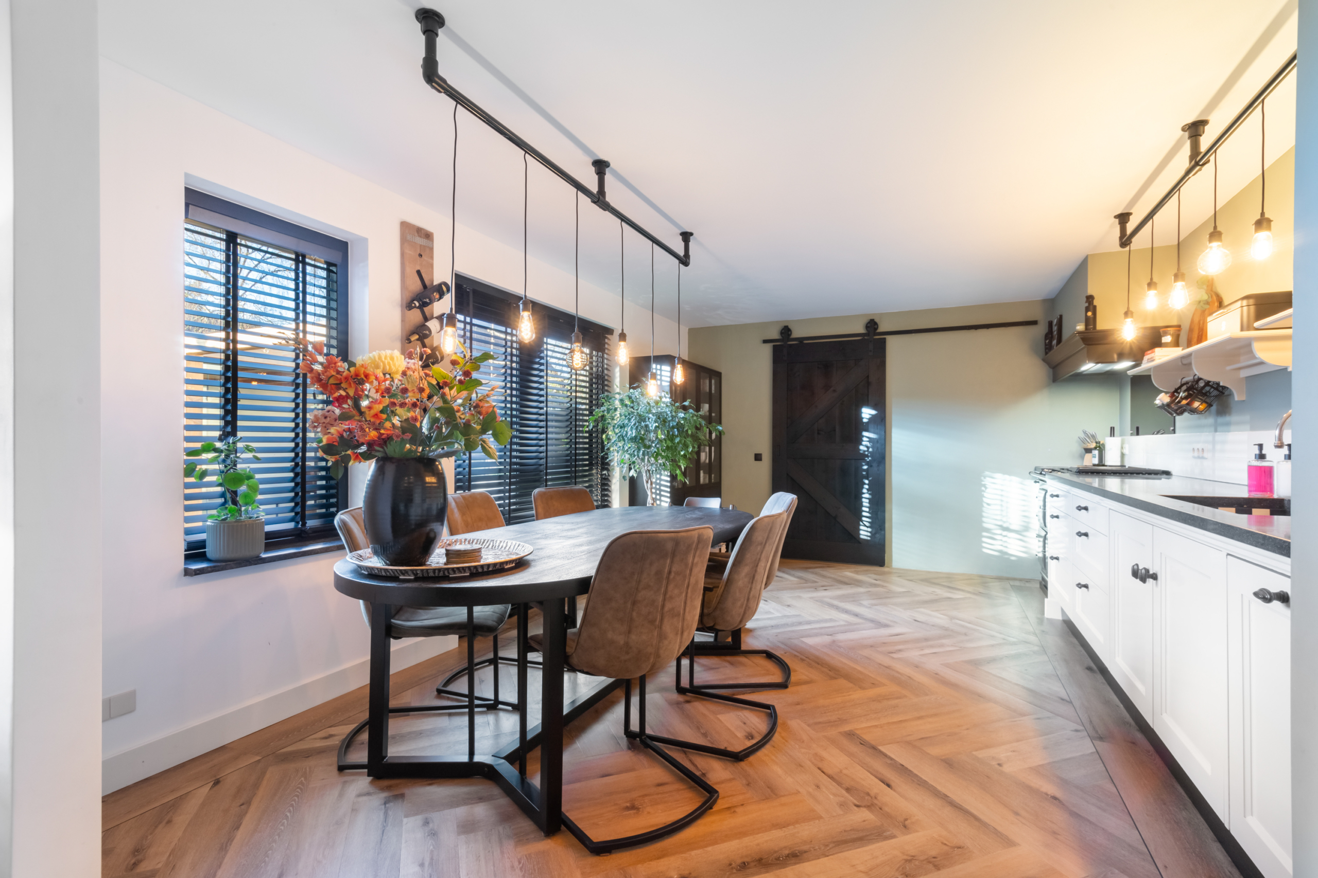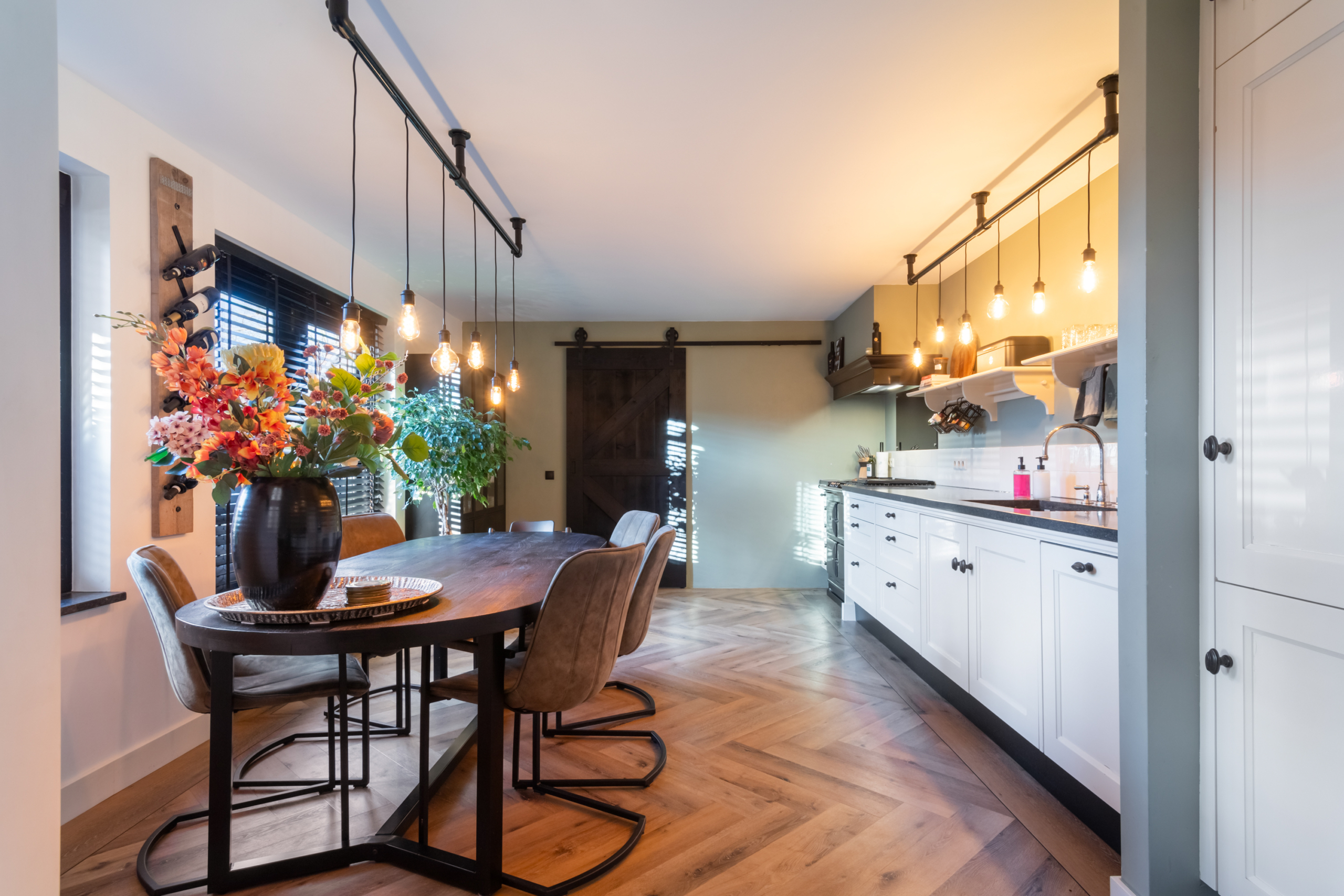 Vanuit de woonkamer is er een open verbinding met de ruime woonkeuken. De open verbinding is voorbereid op een dubbele en-suite deur om de woonkeuken af te kunnen sluiten van de woonkamer.