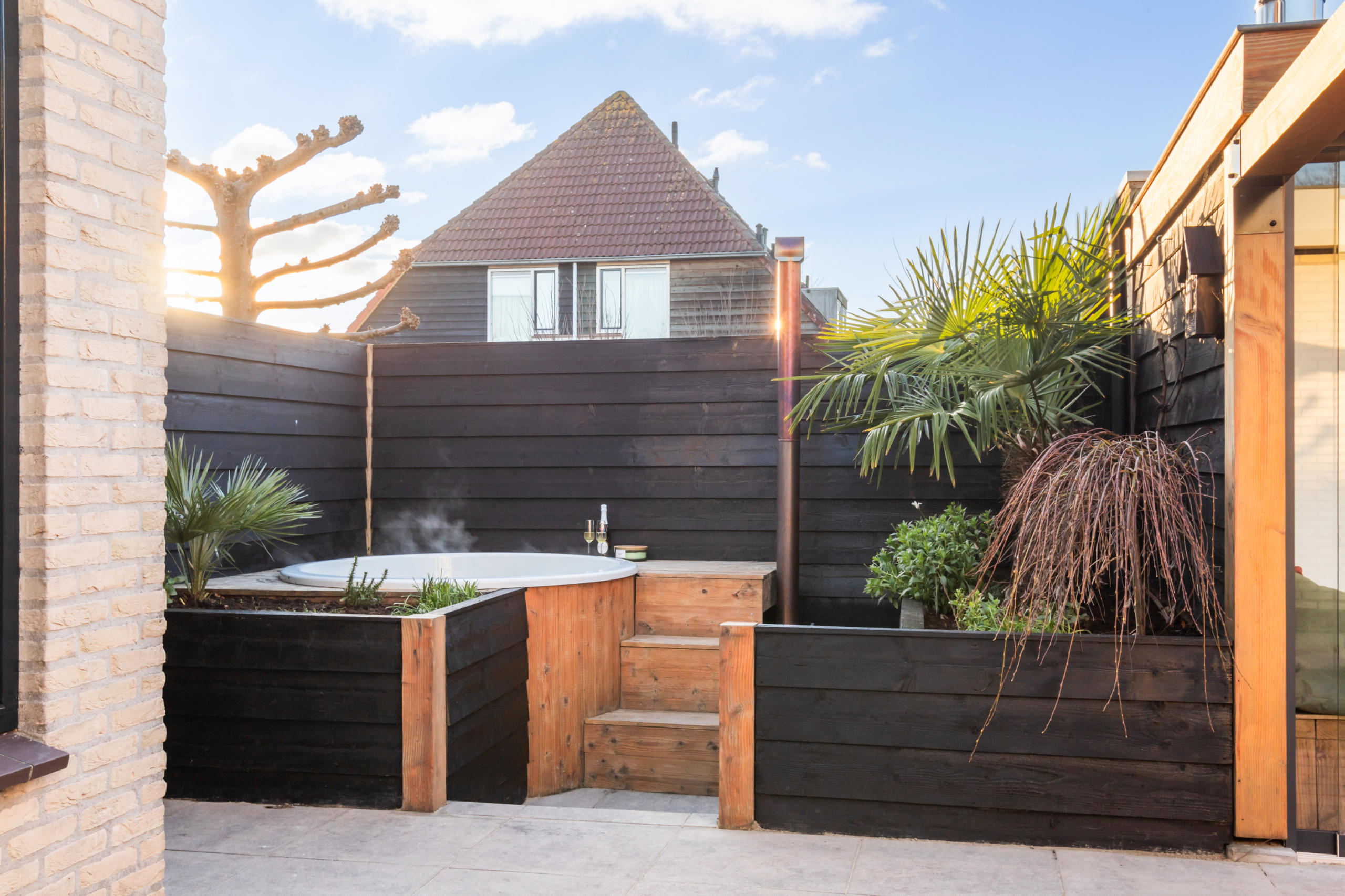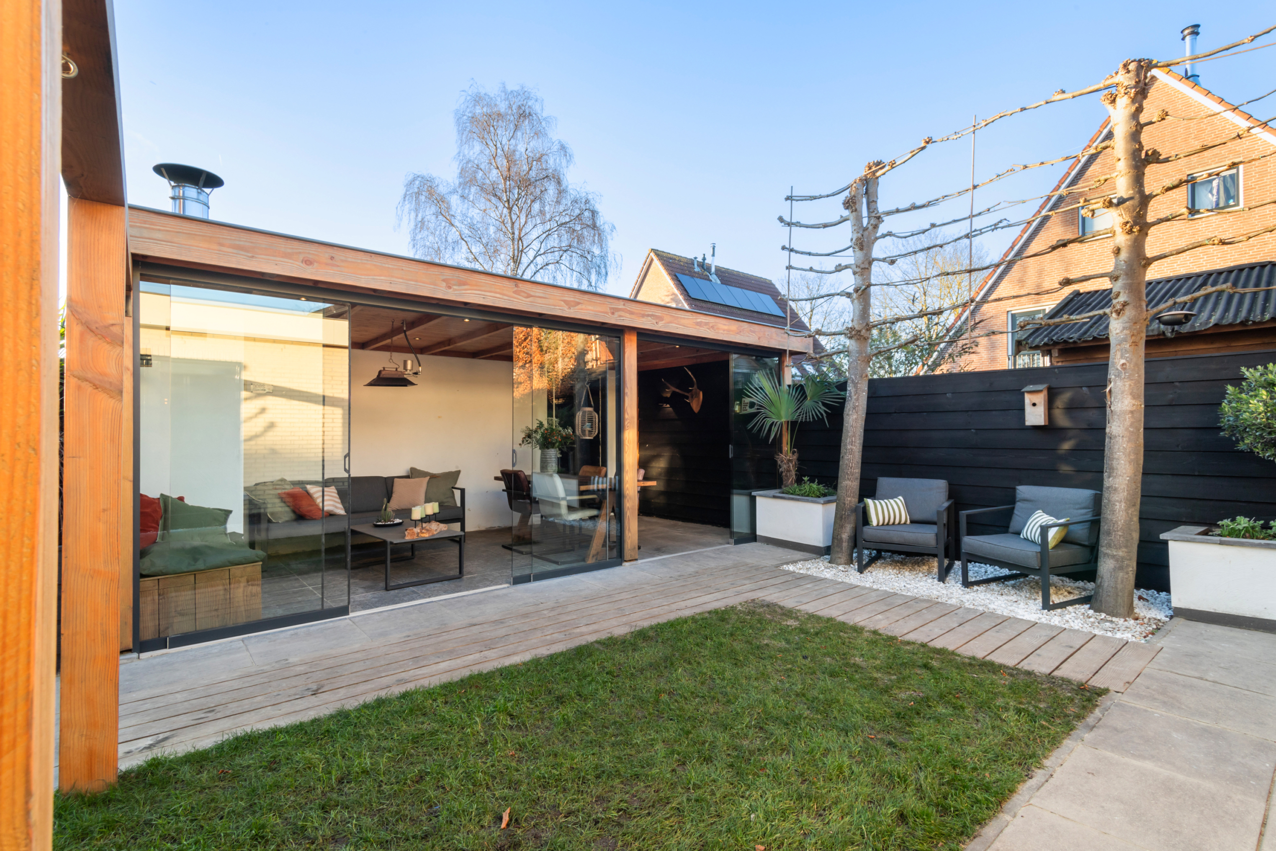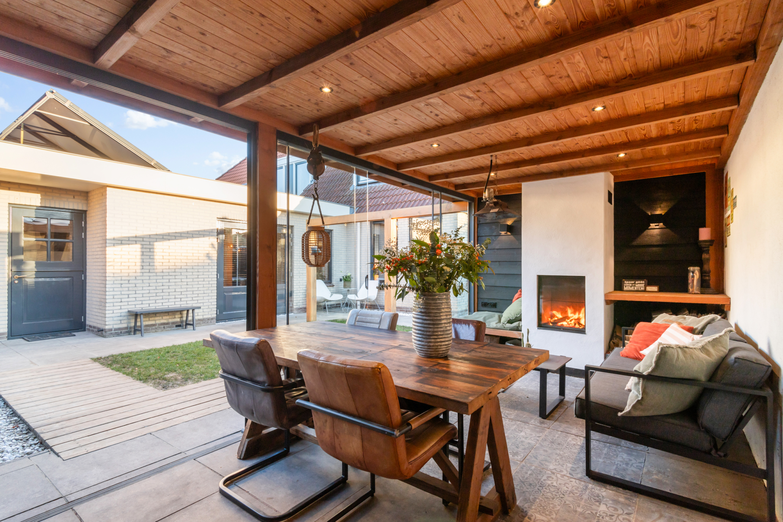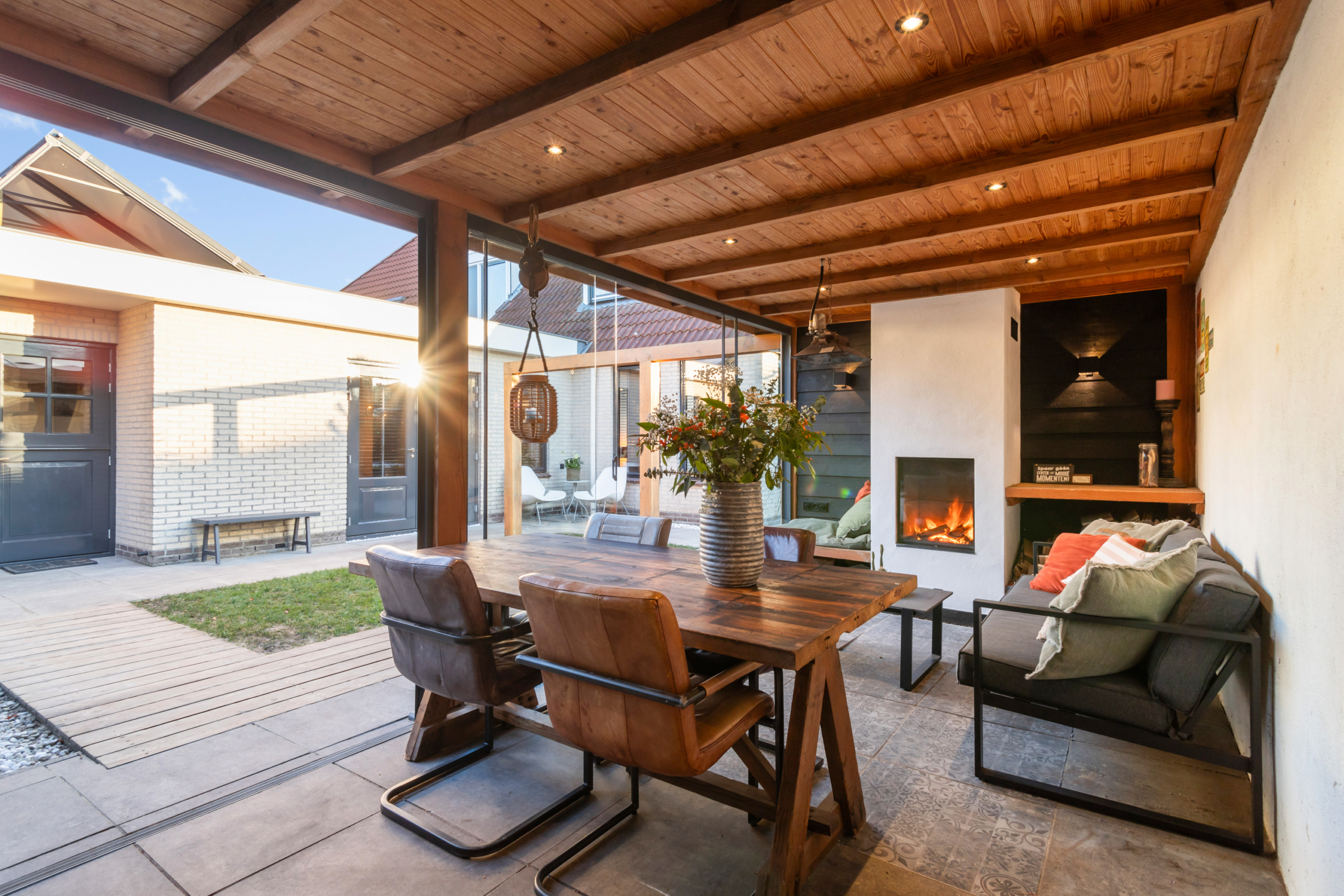 Met de tuinligging op het zuidwesten is het de hele dag heerlijk toeven in het zonnetje, maar ook aan de schaduwplekjes is gedacht doordat er een grote veranda aangebouwd is aan de garage. Hierin bevindt zich een glazen schuifwand en een open haard zodat je hier in alle jaargetijden heerlijk kunt recreëren. Om het luxe tuinleven helemaal compleet te maken is naast de veranda een houtgestookte hottub aanwezig!