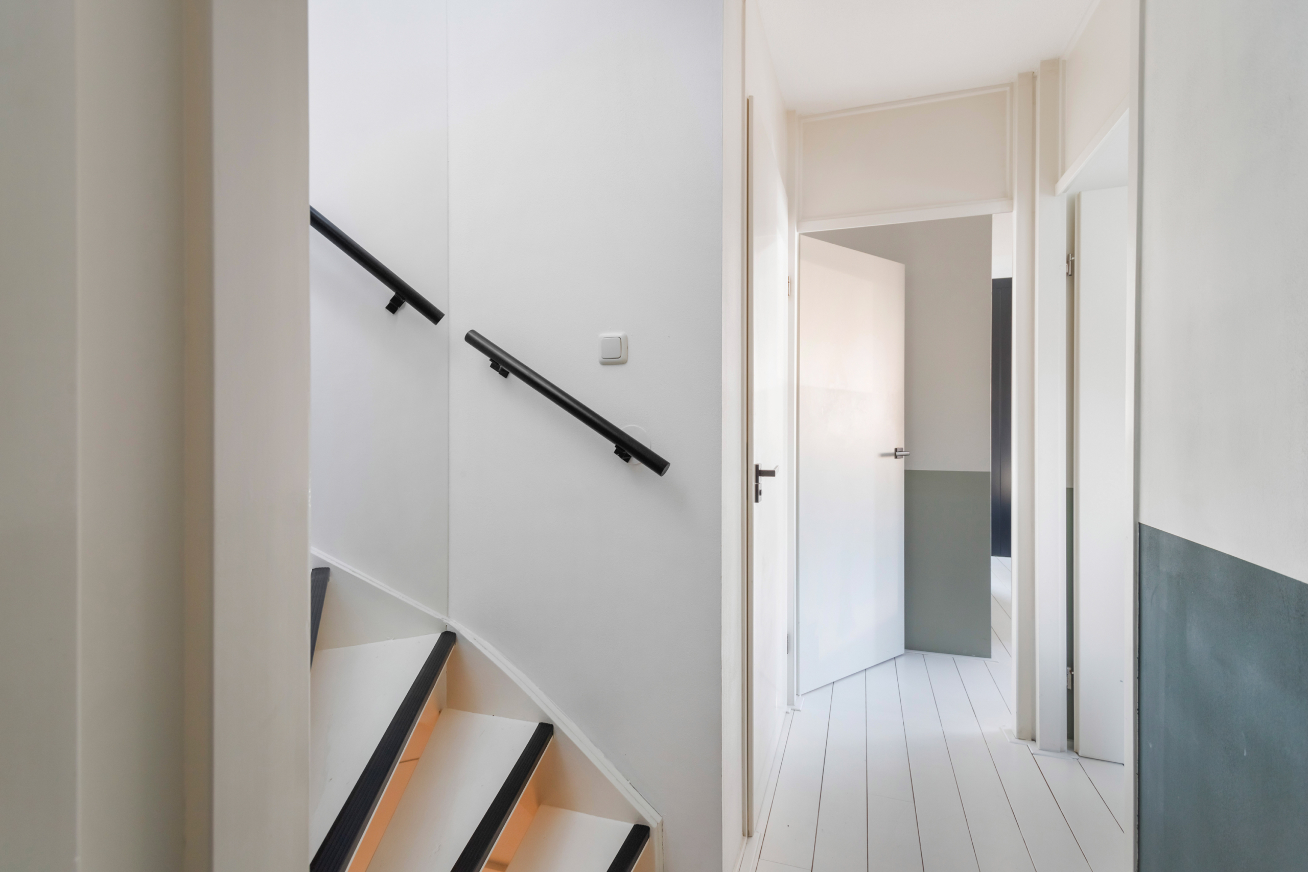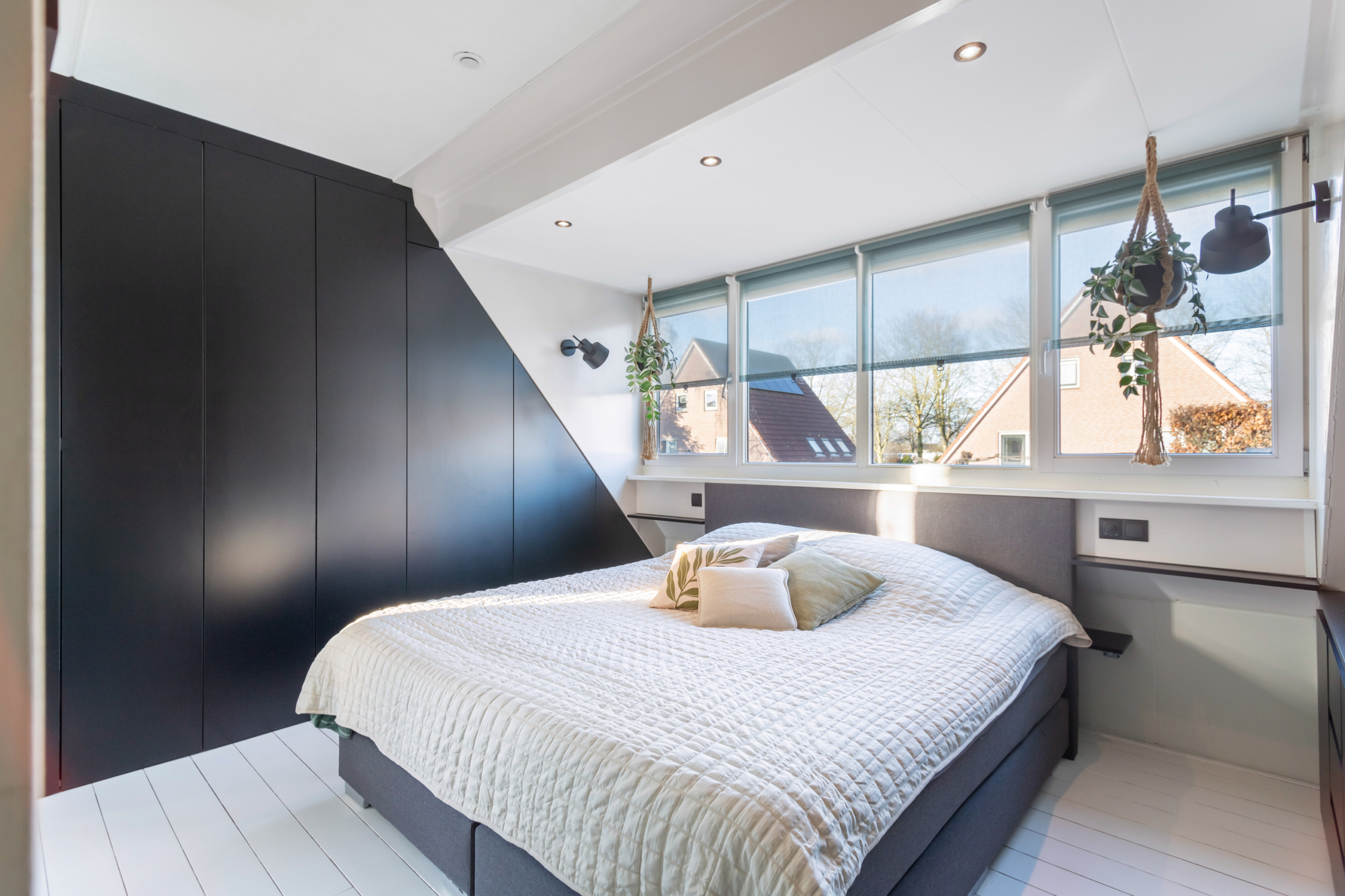 Eerste verdieping – voorzien van witte houten vloer. Via de overloop is er toegang tot twee ruime slaapkamers en een luxe ruime badkamer. Over de volle breedte van de ouderslaapkamer is een grote dakkapel met elektrisch rolluik geplaatst waardoor er extra ruimte en licht ontstaat. Ook is hier een zeer ruime inbouwkast aanwezig. In de tweede slaapkamer is in de dakkapel net een nieuwe kunststofpaneel en HR++ glas geplaatst. Ook hiervoor is een elektrisch rolluik op maat aanwezig, maar nog niet geplaatst. Tevens zijn ook de inbouwkasten in deze kamer nieuw geplaatst. De badkamer is licht van kleurstelling en ook hier is weer gebruik gemaakt van luxe materialen. Zij is voorzien van een los hangend toilet, ruime inloopdouche, wastafel en elektrische vloerverwarming.