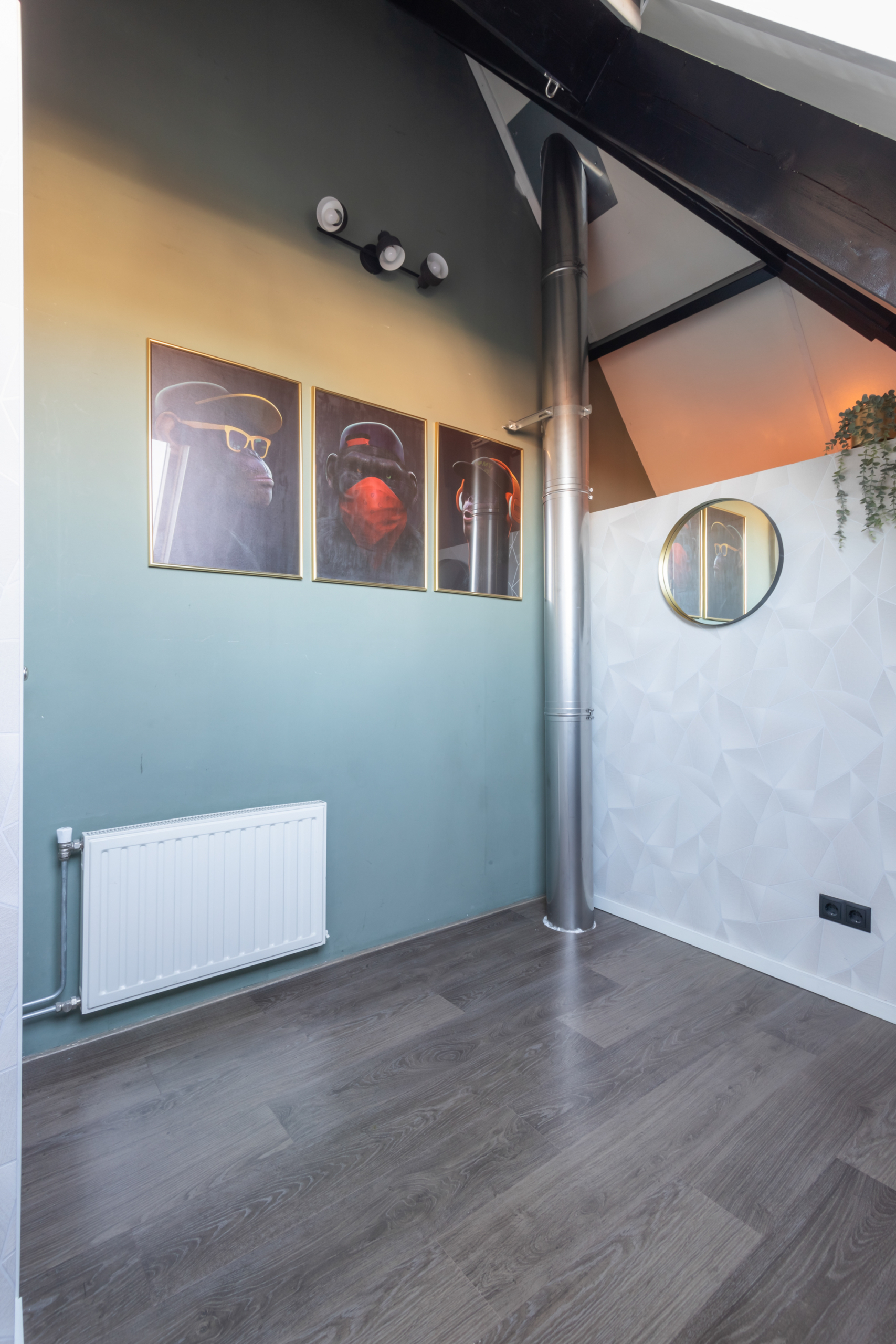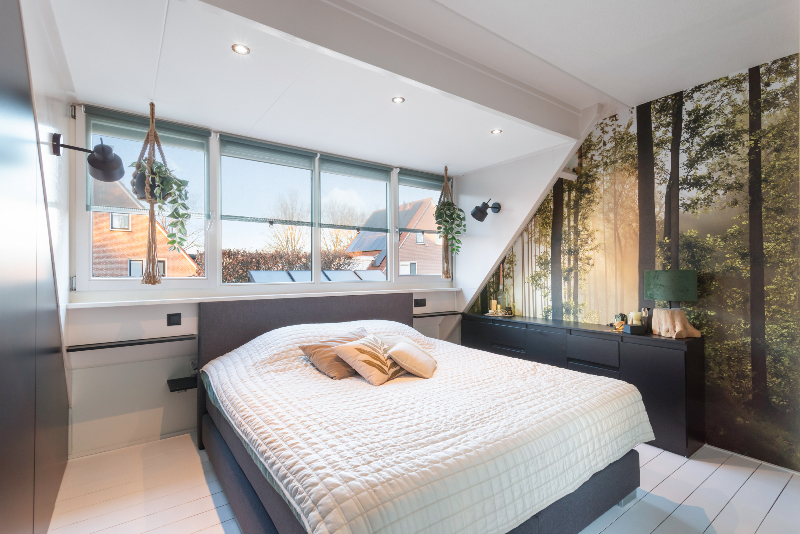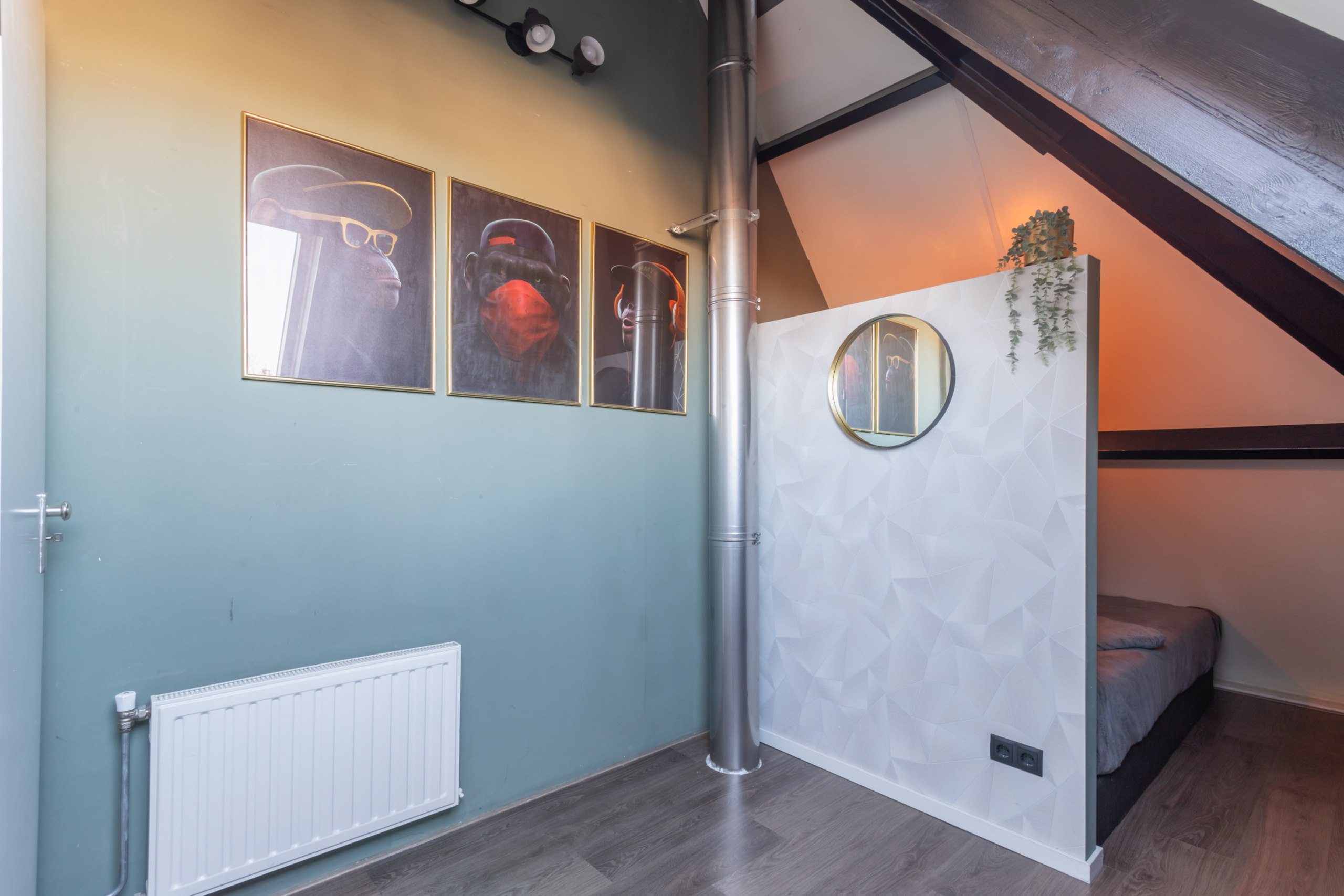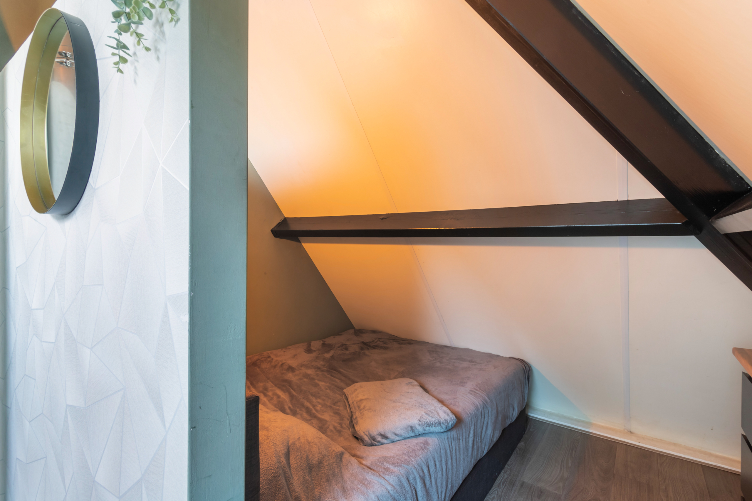 Tweede verdieping – overloop met groot buffervat voor de opvang van warmwater en de wasmachine en -droger aansluiting alsmede de MV-unit. Daarnaast toegang tot de derde slaapkamer voorzien van dakraam. Door middel van een extra wandje is er een knusse slaaphoek gecreëerd. Van hieruit ook toegang tot de technische bergkast met daarin de CV-ketel.