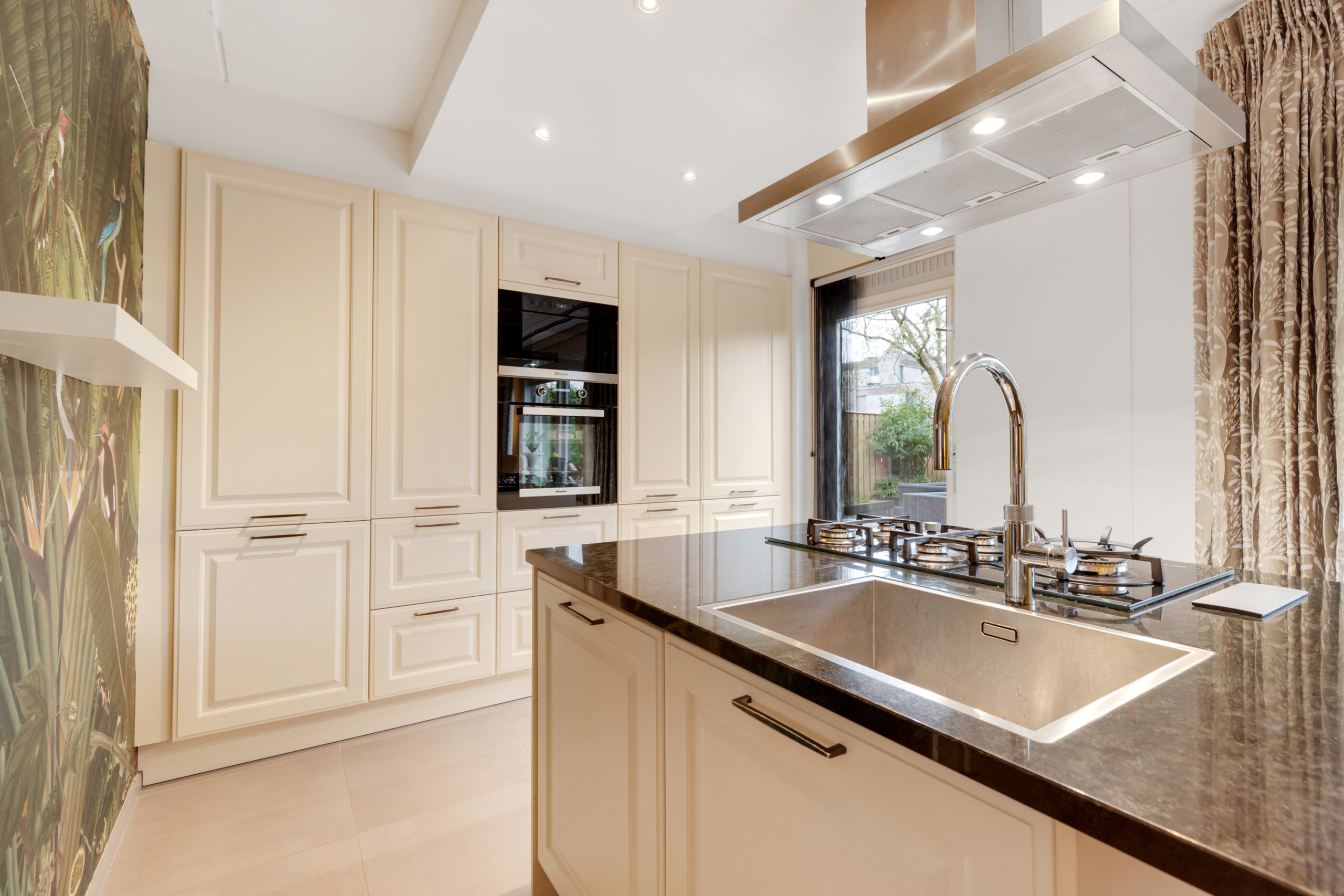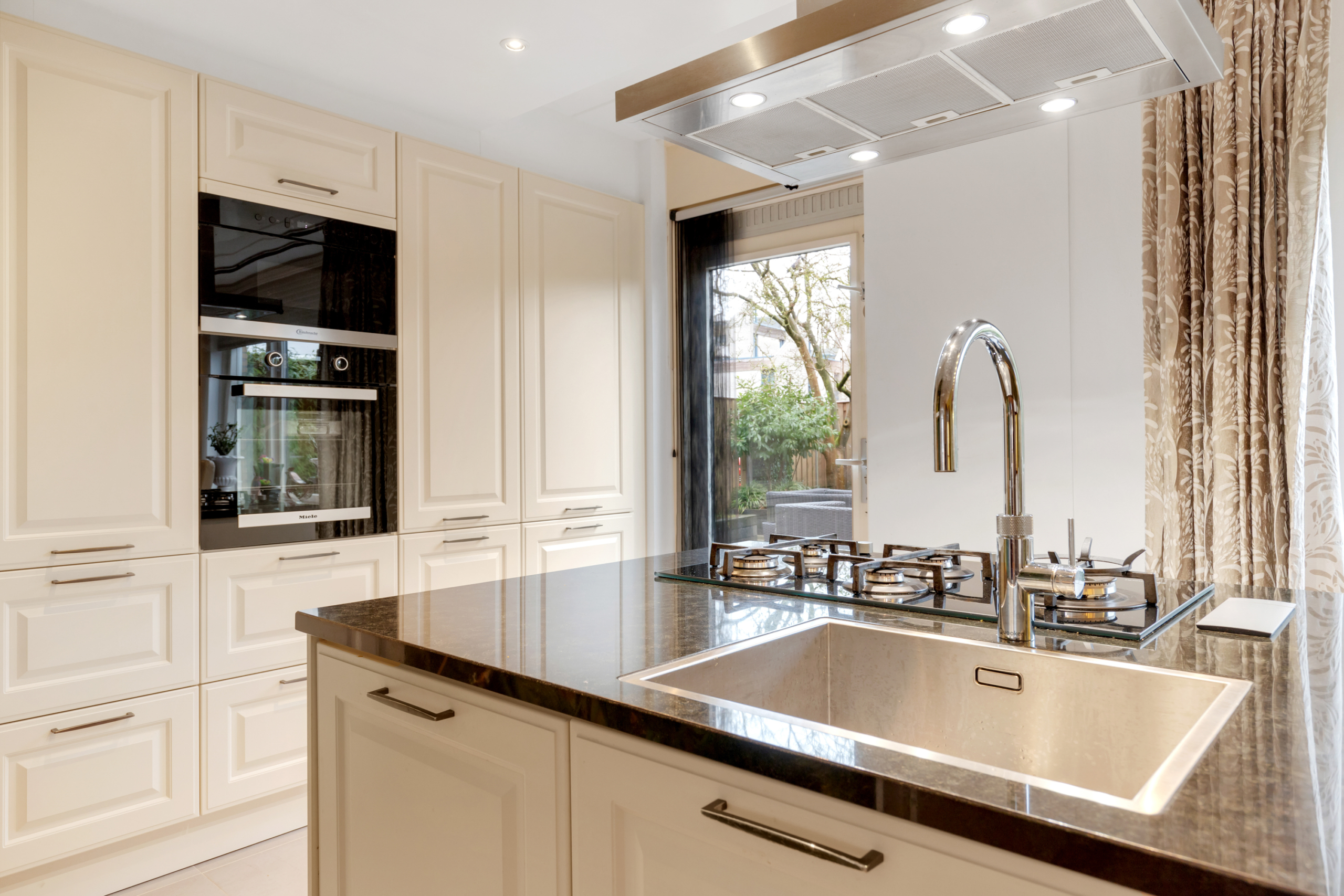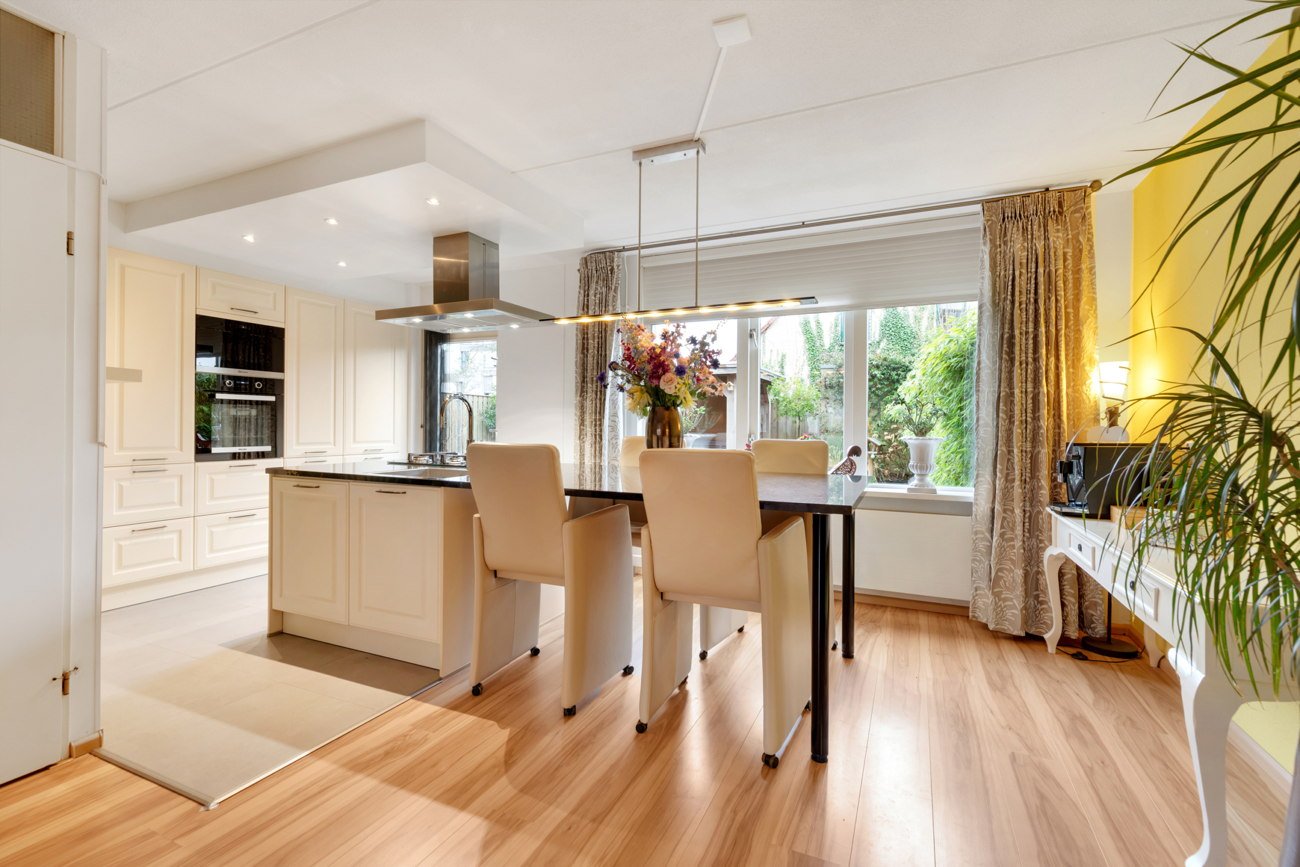 Begane grond – entree met meterkast en doorgang naar de zeer ruime woonkamer met open keuken. Door de vele ramen aan zowel de voor- als de achterkant is de woonkamer/keuken heerlijk licht. De open keuken aan de achterzijde van de woning is luxe en ruim qua opstelling met een grote apparatenwand met daarin een grote koelkast en aparte vriezer en combi-oven en magnetron. Het keukeneiland heeft een nieuwe vaatwasser, koken met gas op een glasplaat, afzuigkap en een gootsteen met een Quooker-kraan. Aansluitend loopt het natuurstenen blad door in een gezellige eettafel.