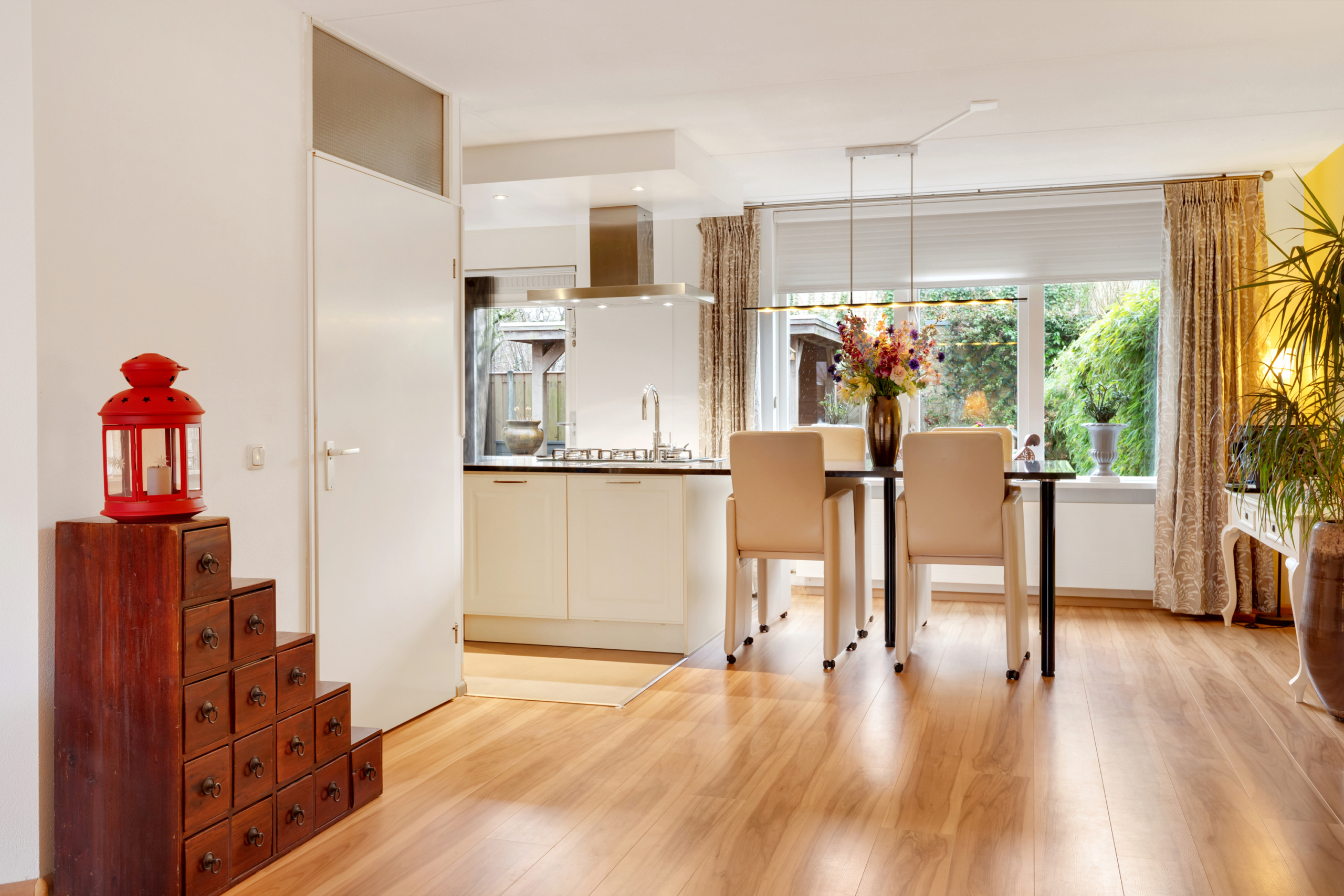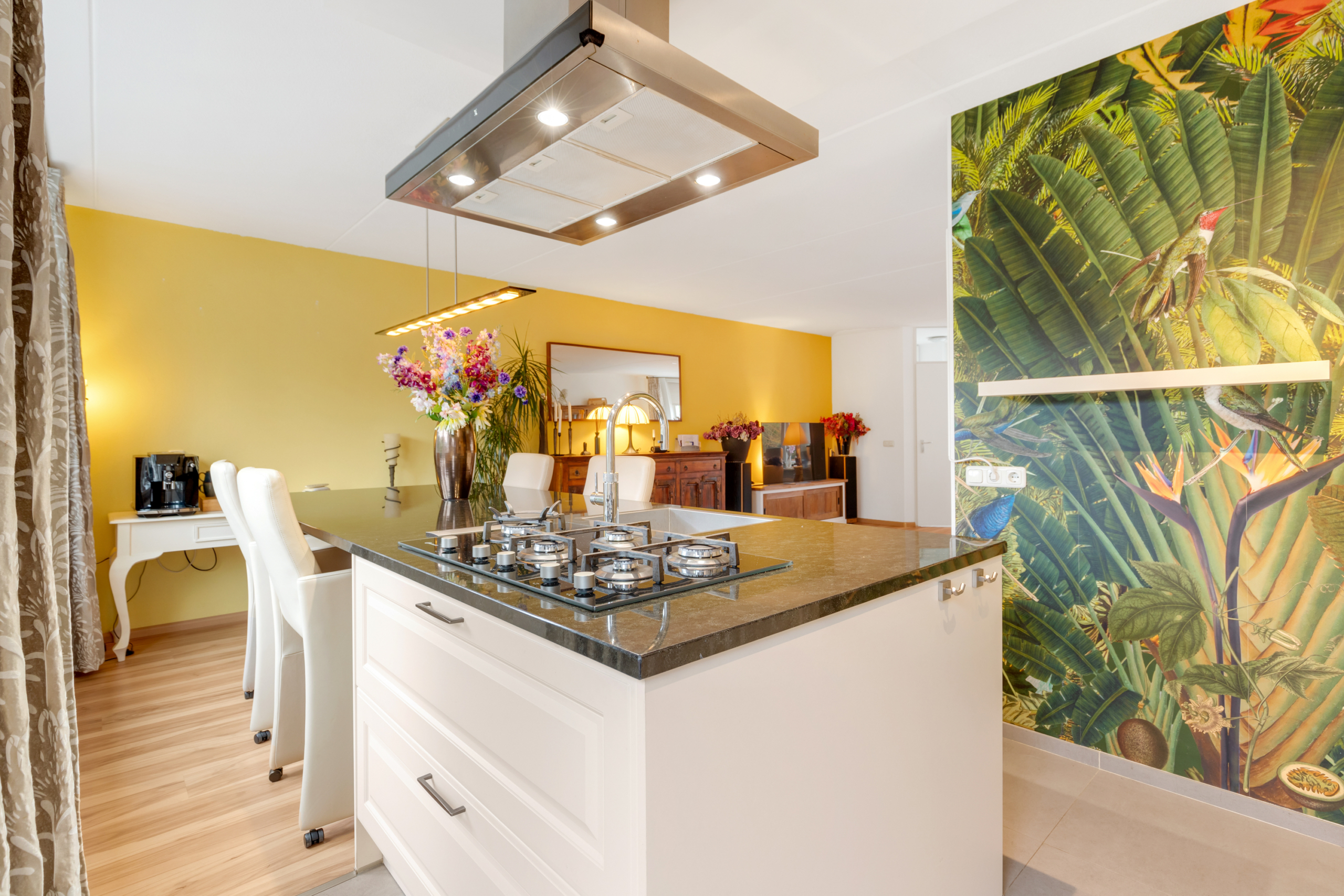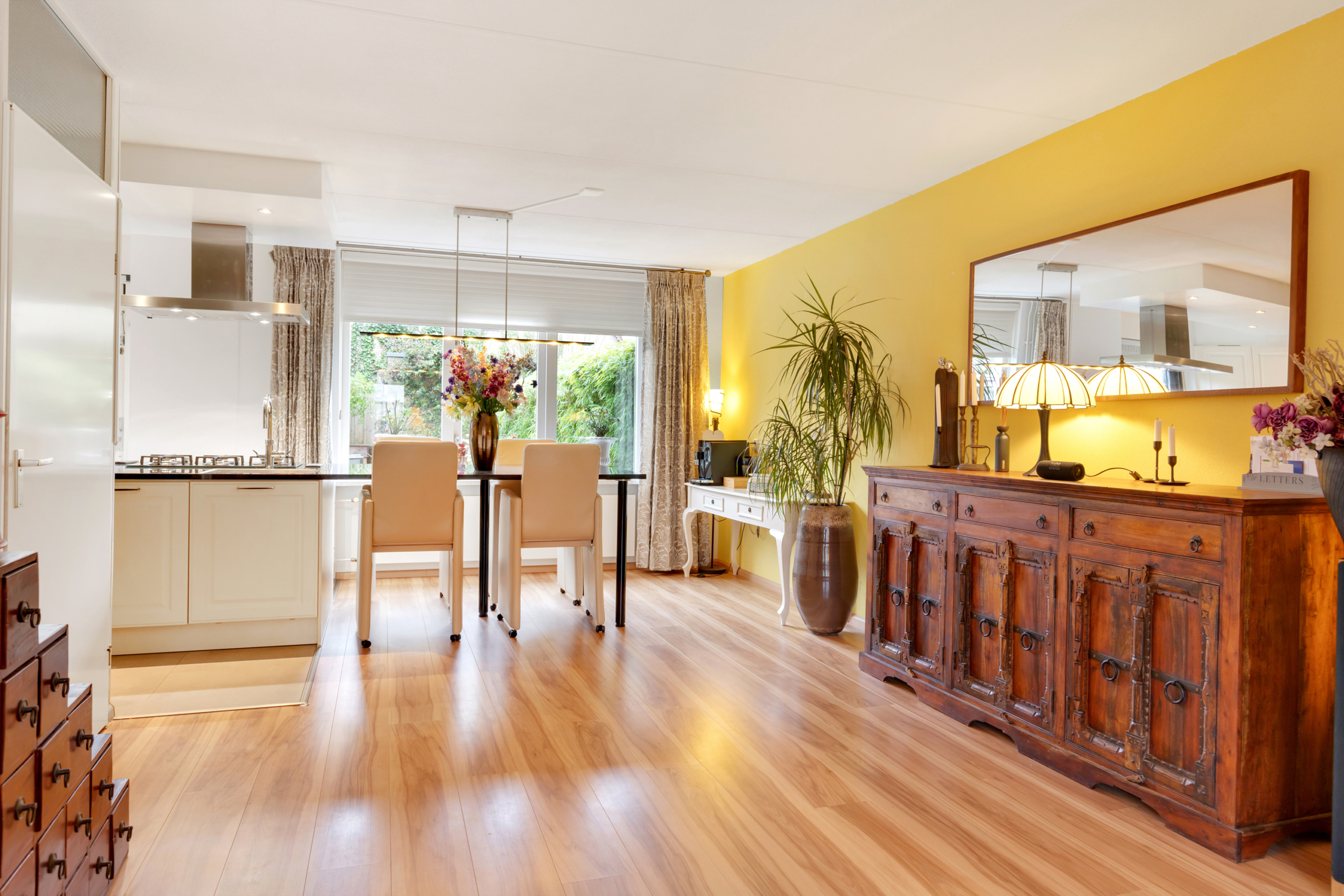 Begane grond – entree met meterkast en doorgang naar de zeer ruime woonkamer met open keuken. Door de vele ramen aan zowel de voor- als de achterkant is de woonkamer/keuken heerlijk licht. De open keuken aan de achterzijde van de woning is luxe en ruim qua opstelling met een grote apparatenwand met daarin een grote koelkast en aparte vriezer en combi-oven en magnetron. Het keukeneiland heeft een nieuwe vaatwasser, koken met gas op een glasplaat, afzuigkap en een gootsteen met een Quooker-kraan. Aansluitend loopt het natuurstenen blad door in een gezellige eettafel.
