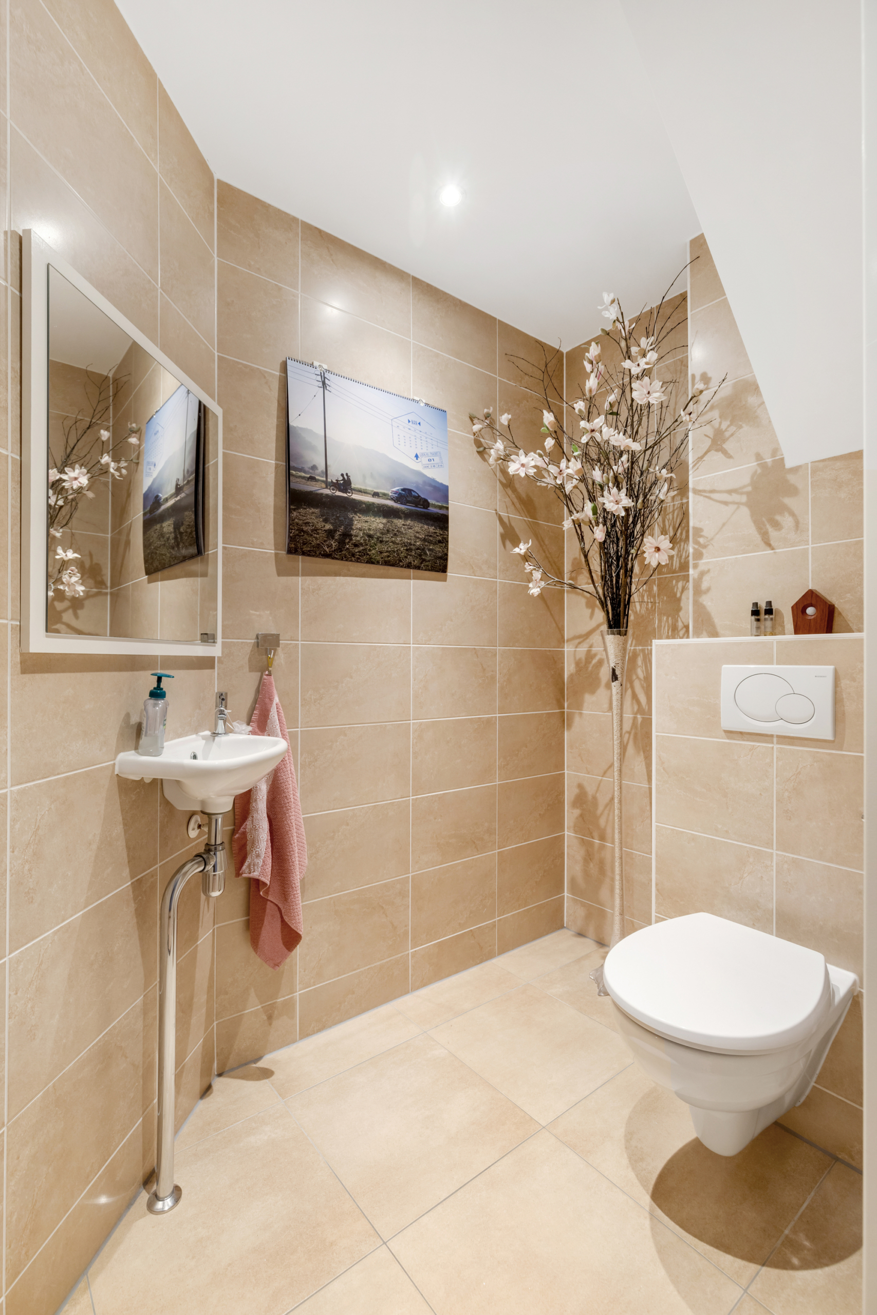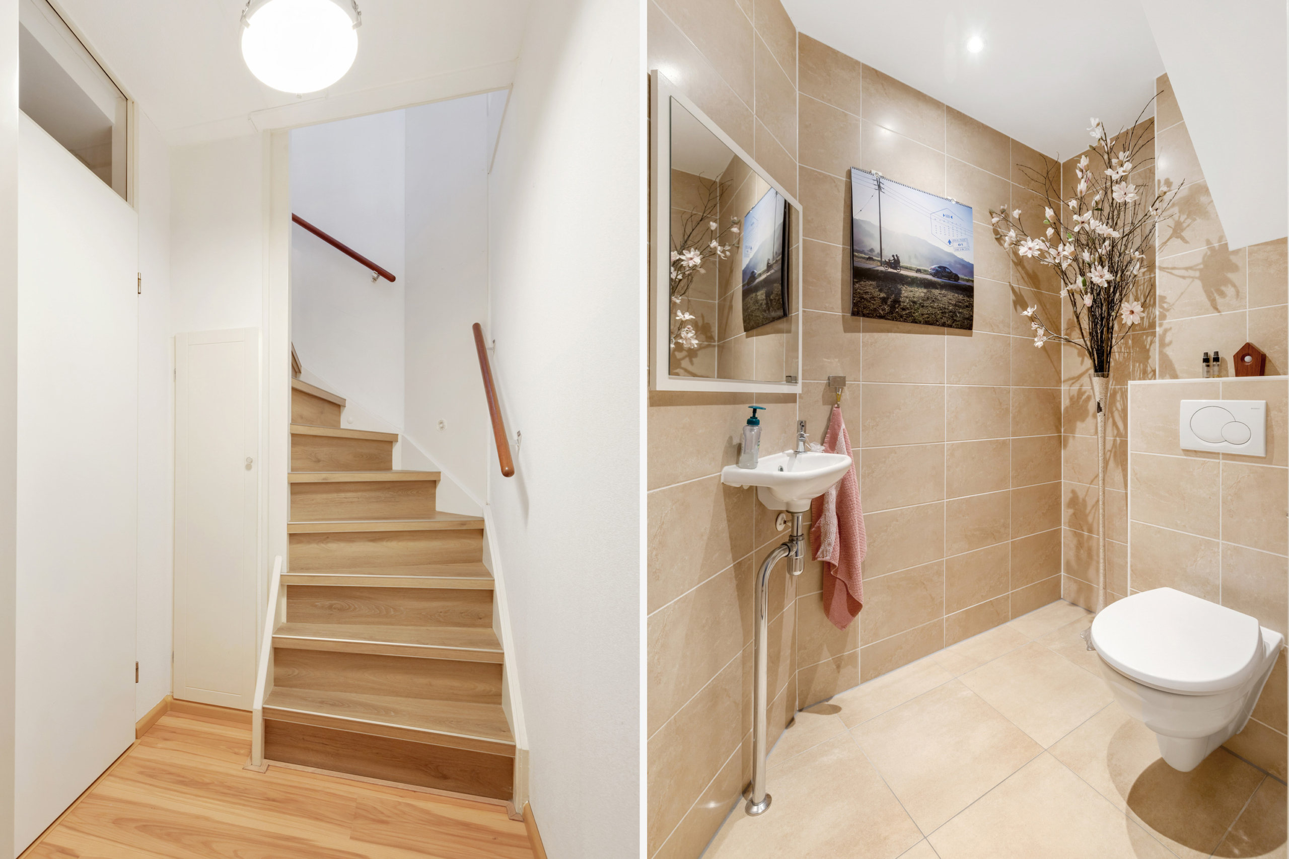 Weer binnengekomen ga je via een aparte hal naar de zeer ruime en luxe toilet en de trapopgang naar de eerste verdieping.