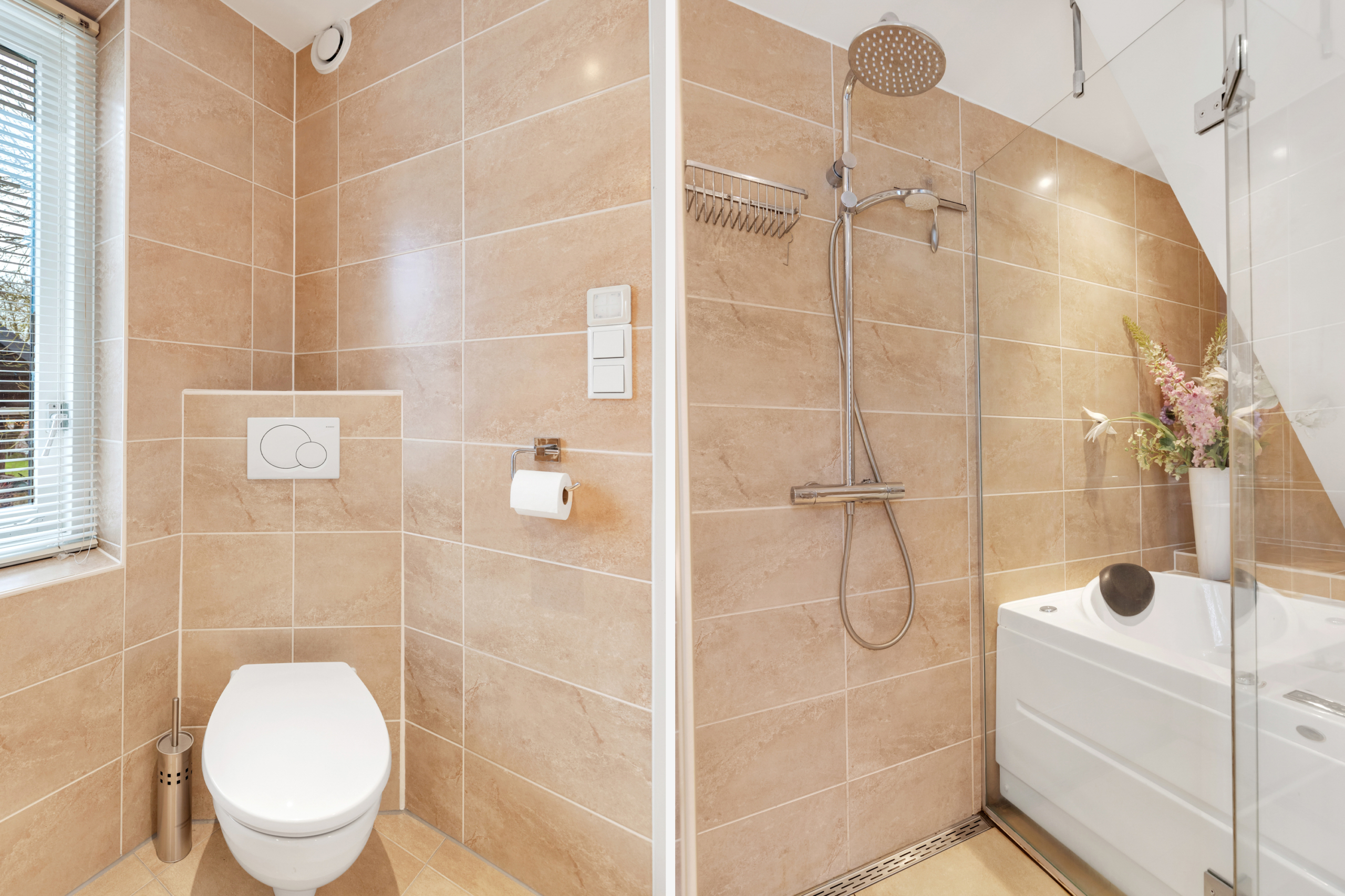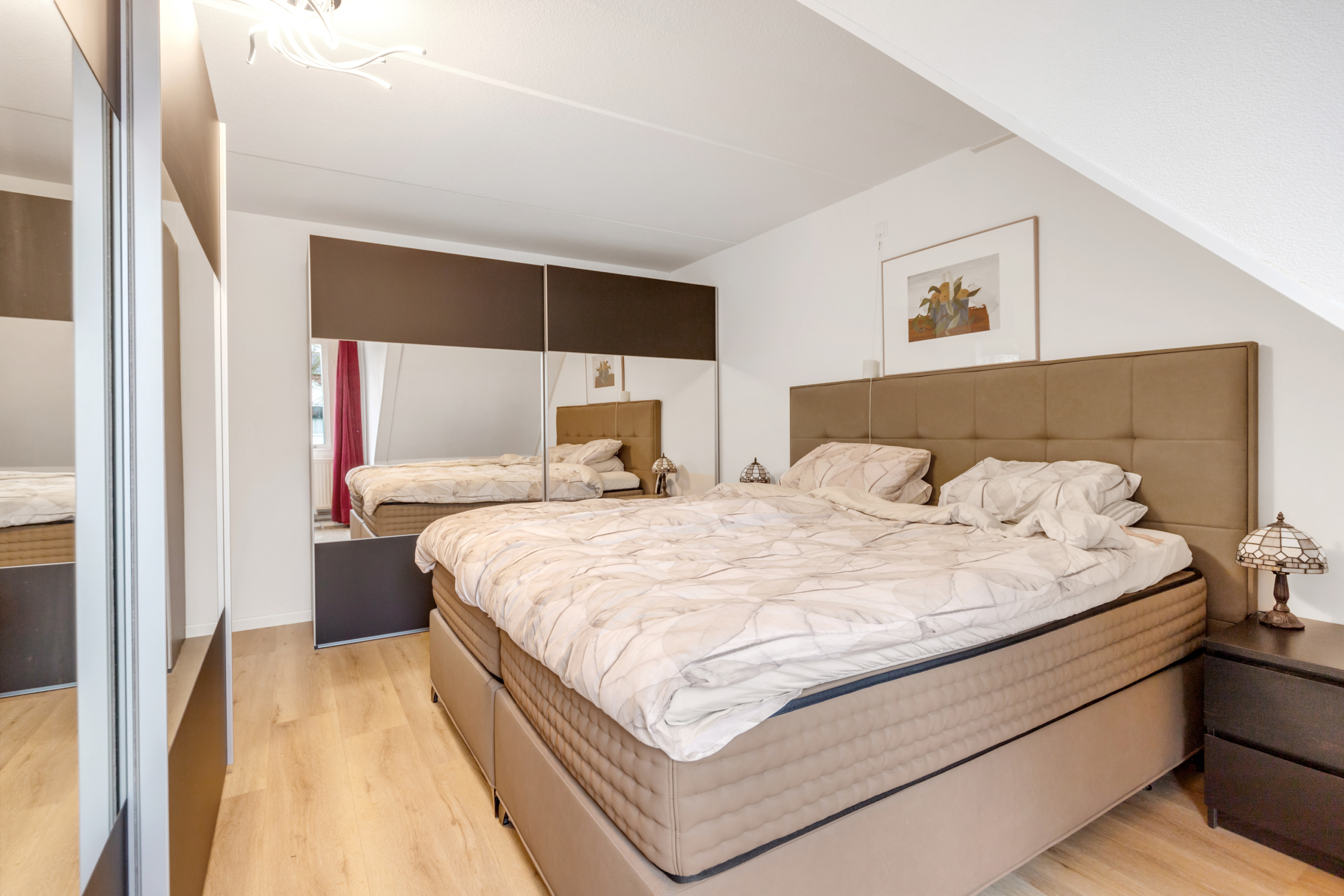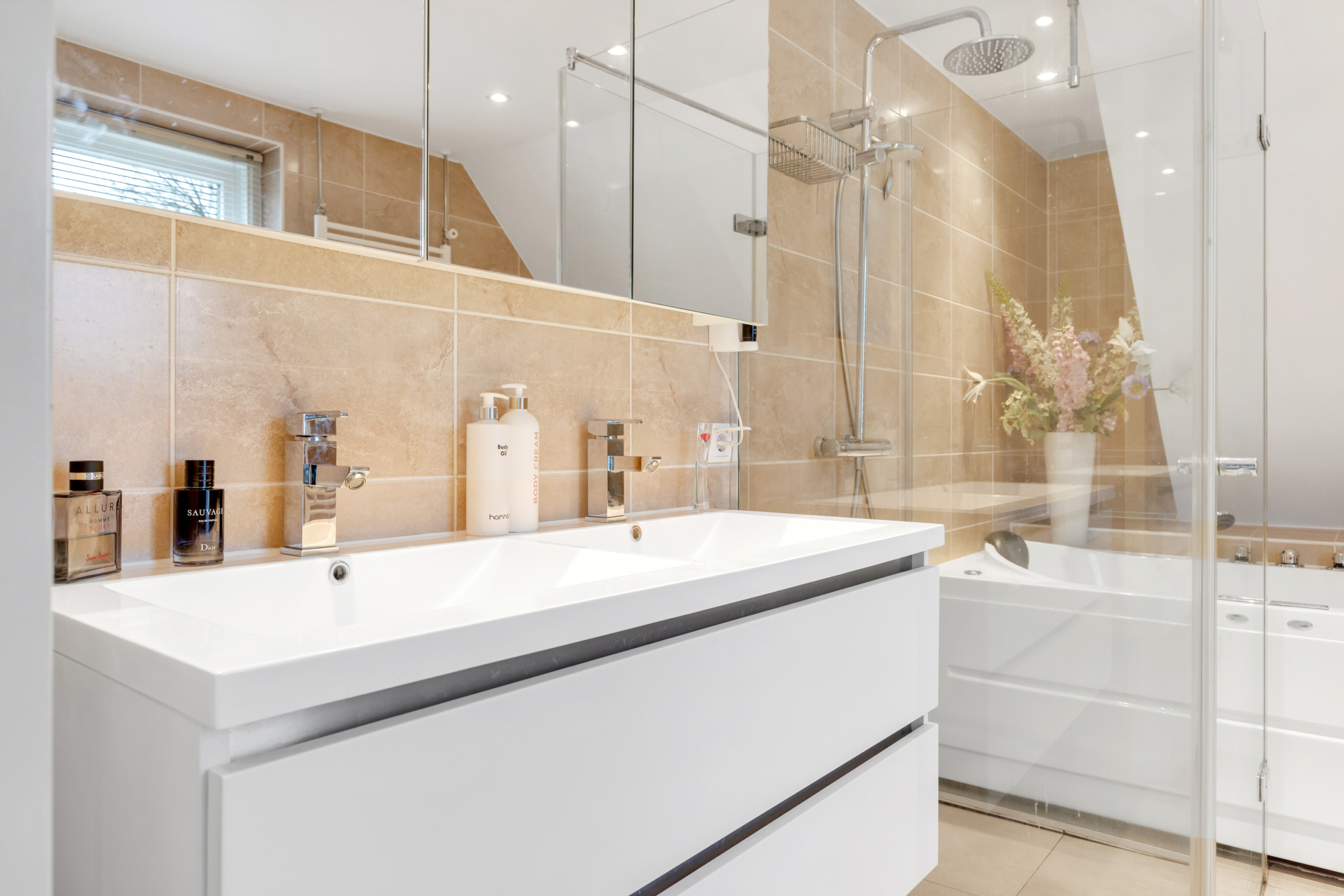 Eerste verdieping – via de overloop is er toegang tot twee ruime slaapkamers, een berg/wasruimte en een luxe uitgevoerde badkamer. De slaapkamers en overloop zijn voorzien van een plak PVC-vloer in fraaie houtlook. De berg/wasruimte geeft ruimte aan de wasmachine en droger en de CV-ketel uit 2021. In de badkamer is de sfeer luxe en warm door gebruik van fraaie beige tegels en sanitair. Deze is voorzien van een ruime inloopdouche, een bubbelbad, een hangend toilet en een dubbele wastafel met meubel.