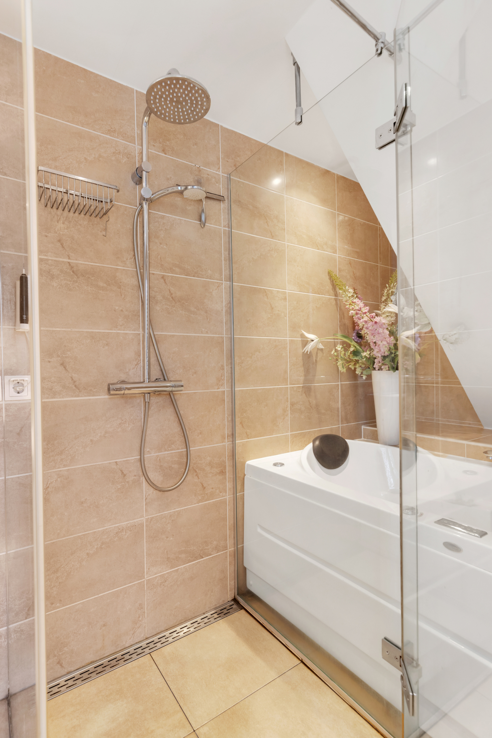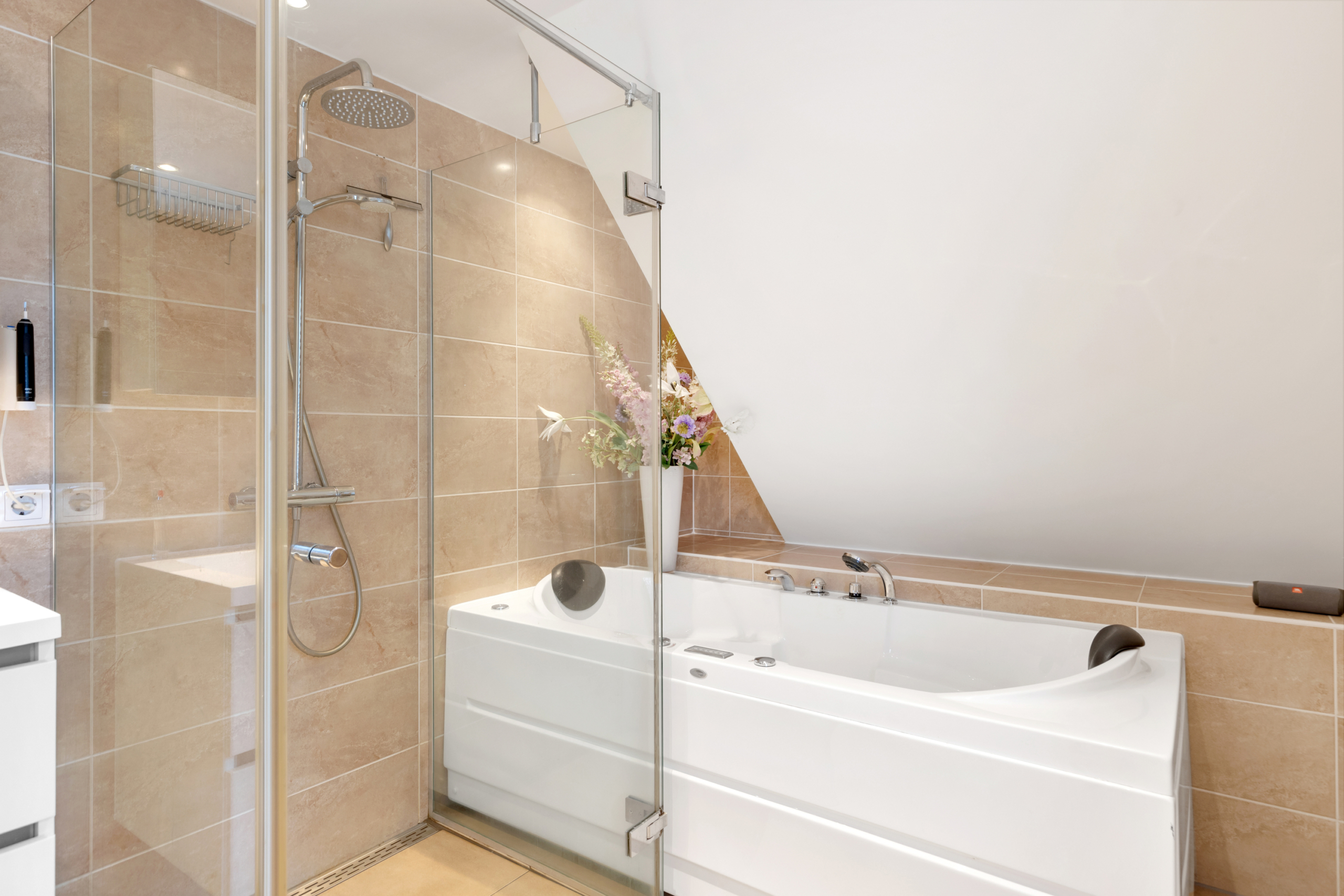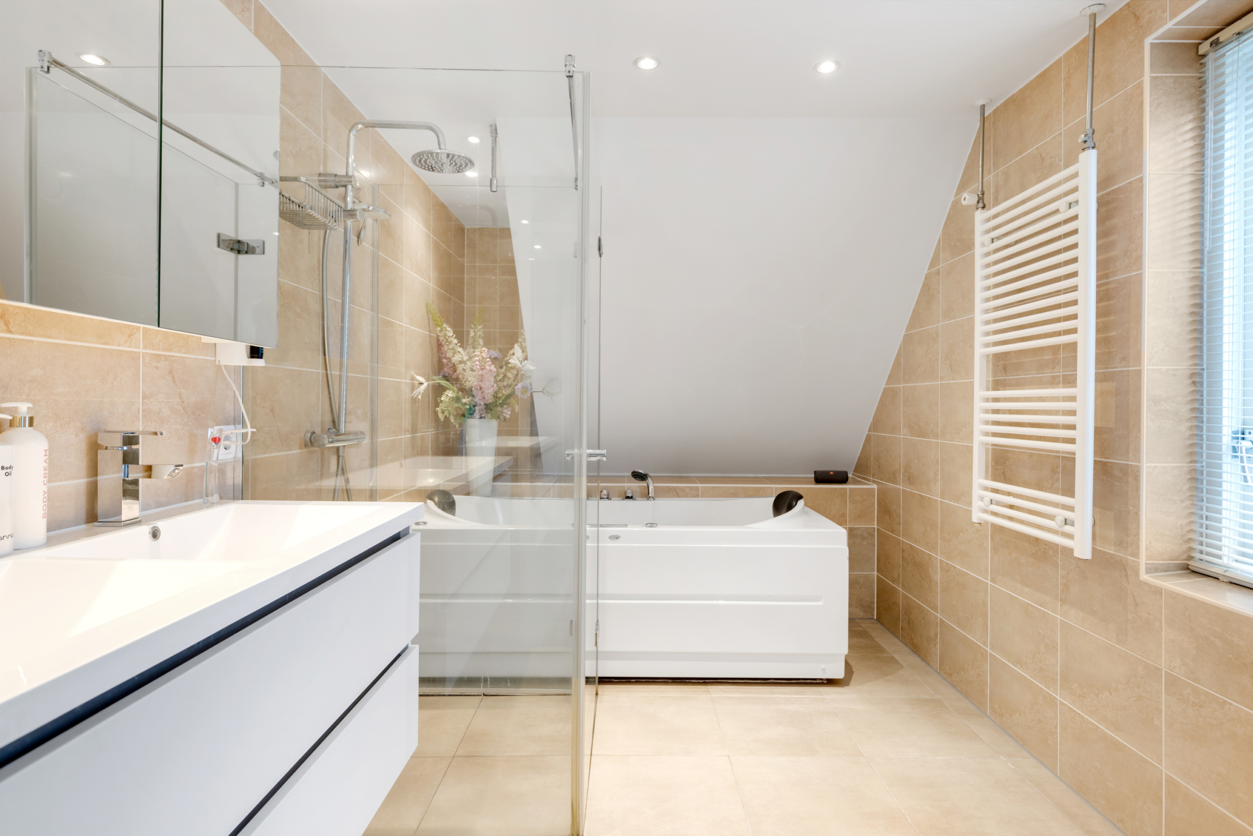 Eerste verdieping – via de overloop is er toegang tot twee ruime slaapkamers, een berg/wasruimte en een luxe uitgevoerde badkamer. De slaapkamers en overloop zijn voorzien van een plak PVC-vloer in fraaie houtlook. De berg/wasruimte geeft ruimte aan de wasmachine en droger en de CV-ketel uit 2021. In de badkamer is de sfeer luxe en warm door gebruik van fraaie beige tegels en sanitair. Deze is voorzien van een ruime inloopdouche, een bubbelbad, een hangend toilet en een dubbele wastafel met meubel.
