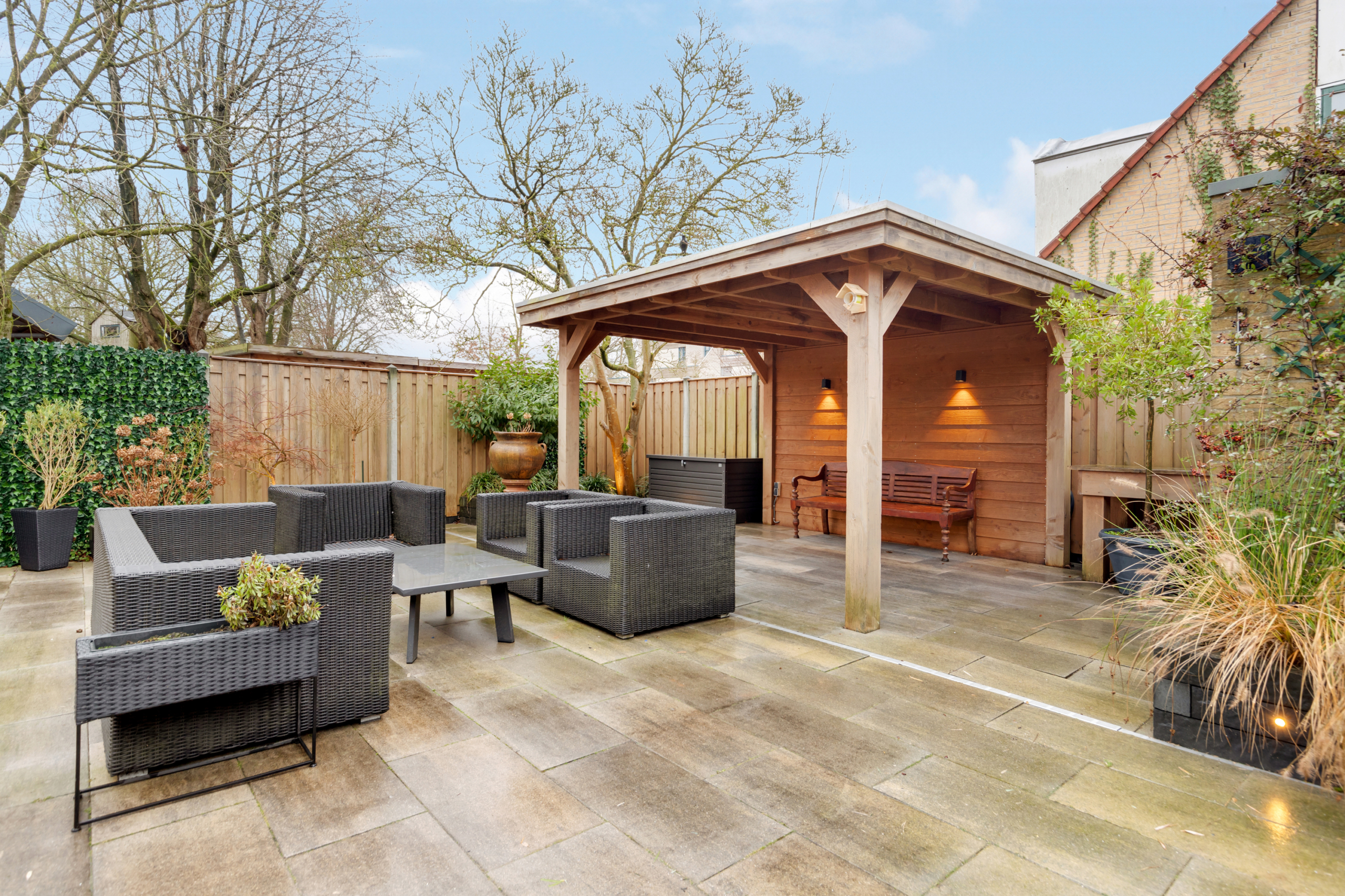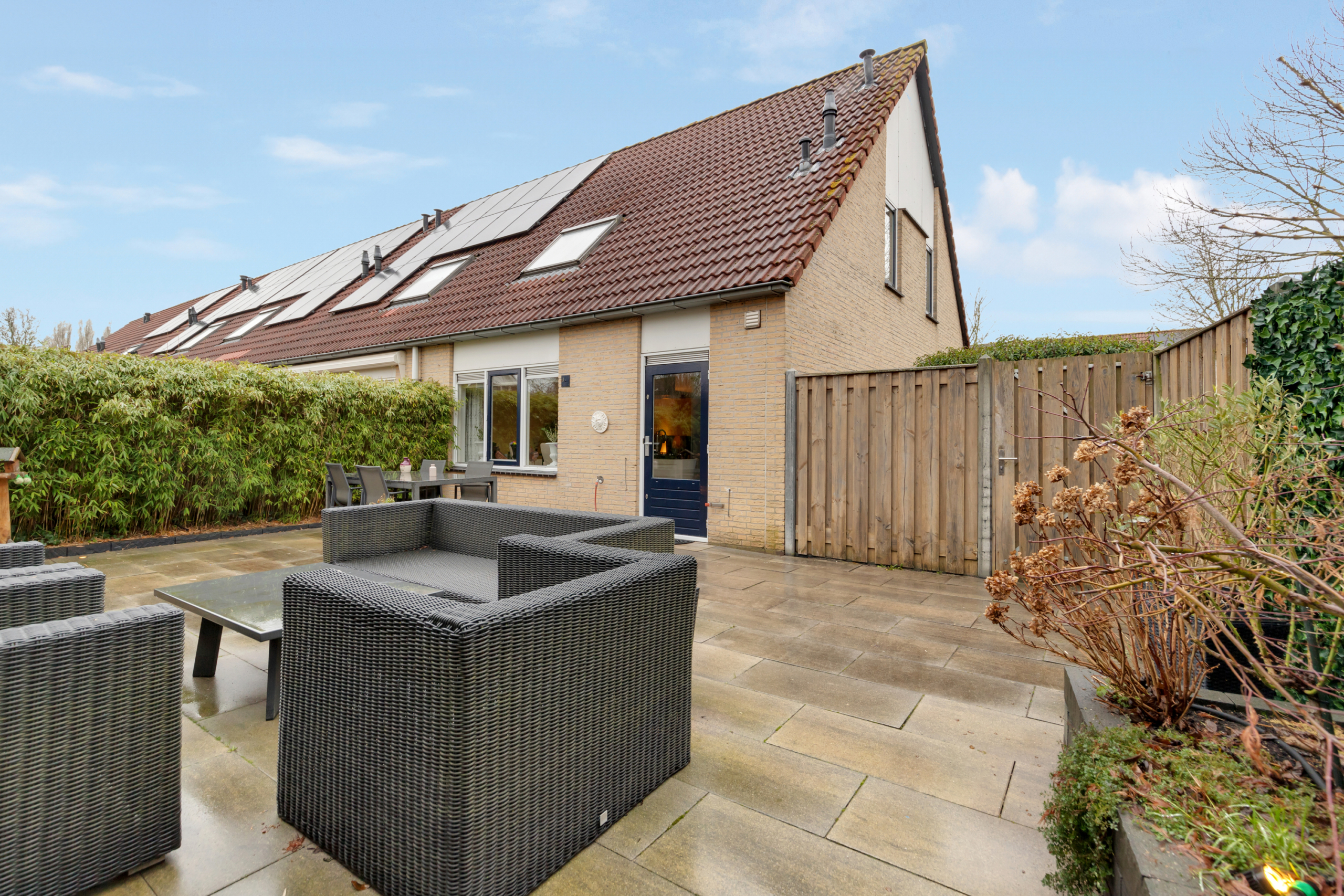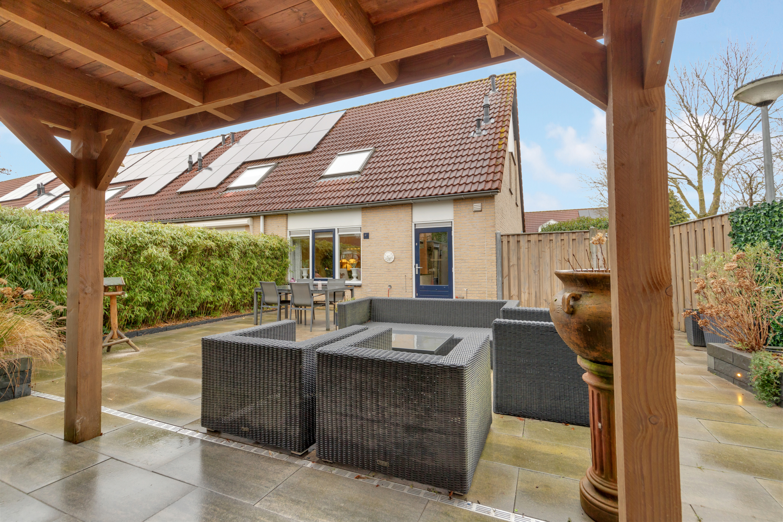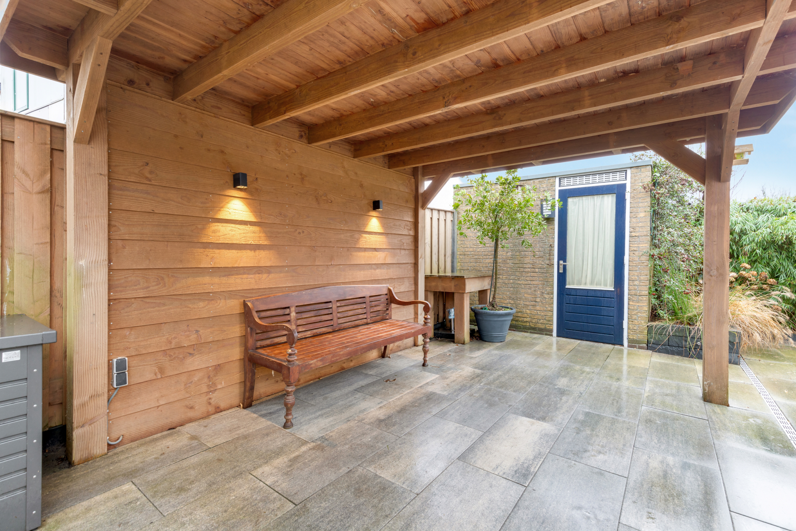 Via de achterdeur kom je in de ruime tuin op het zuiden waardoor er heerlijk veel zon is in de tuin gedurende de gehele dag. De tuin is fraai en onderhoudsarm aangelegd en volledig omheind met een afsluitbaar hekwerk, heeft een heerlijke veranda achter in de tuin en een schuurtje in de hoek. Via de zij ingang kom je zo bij de parkeerplekken. Handig voor het binnenbrengen van de weekboodschappen of het afvoeren van groenafval uit de tuin!
