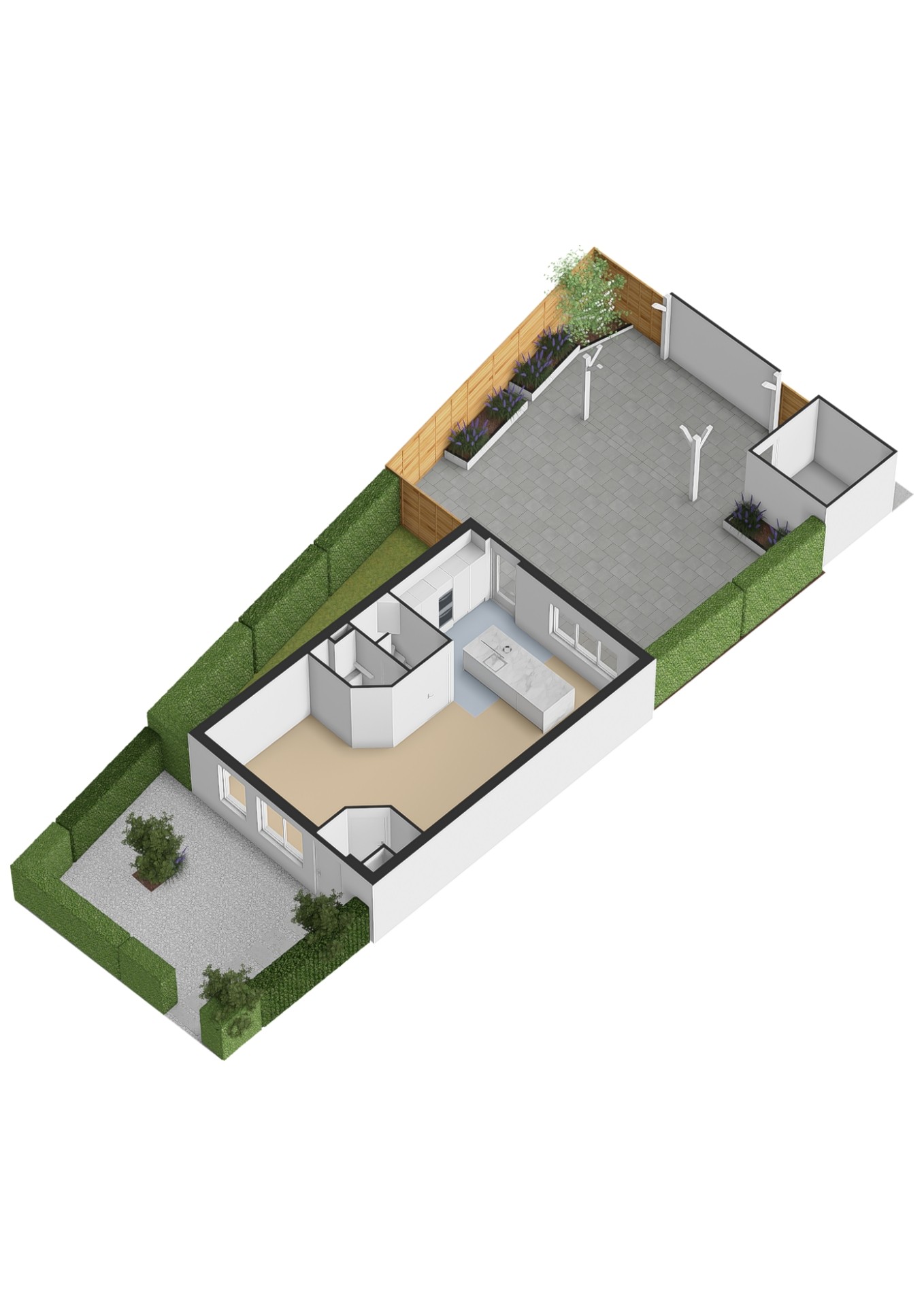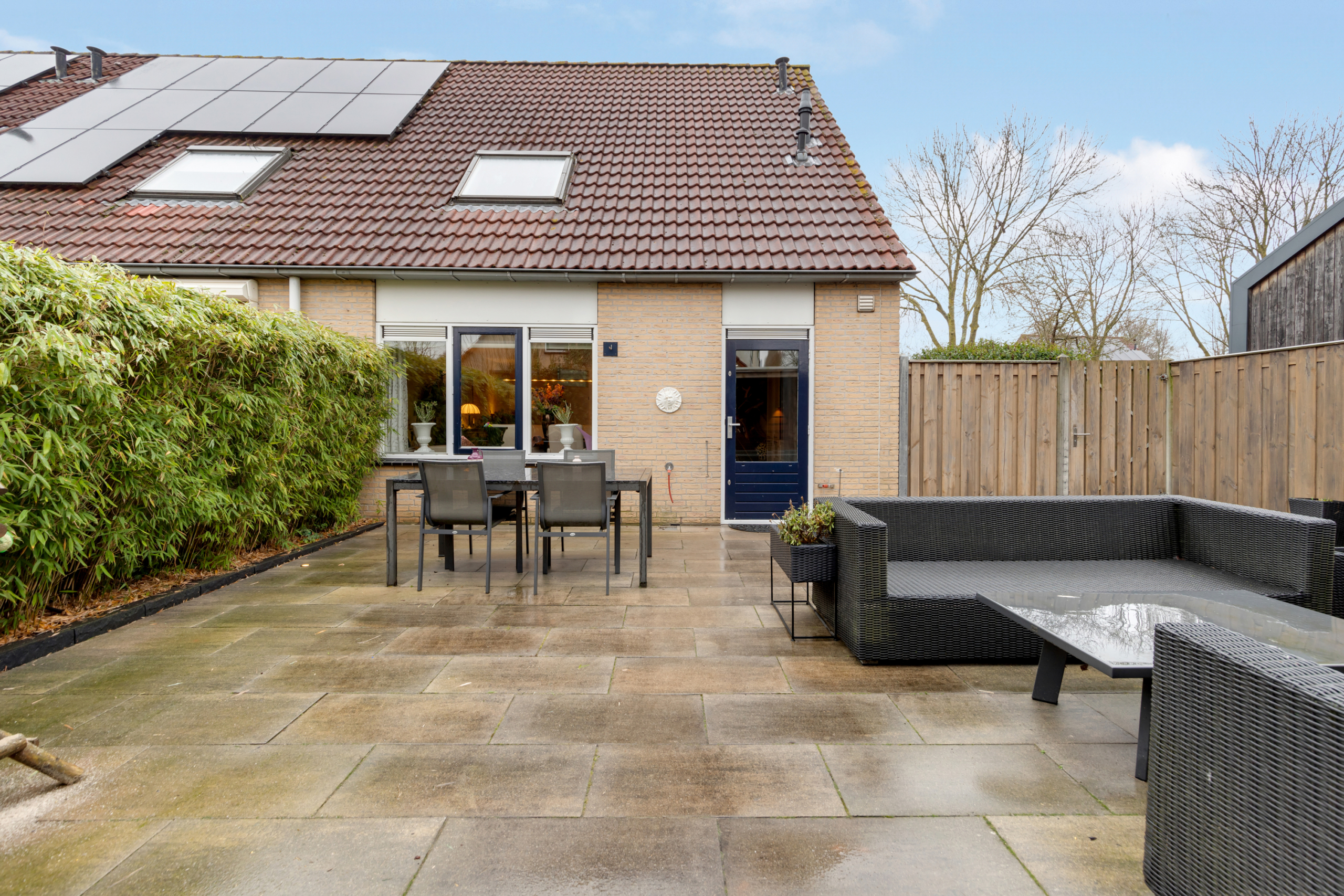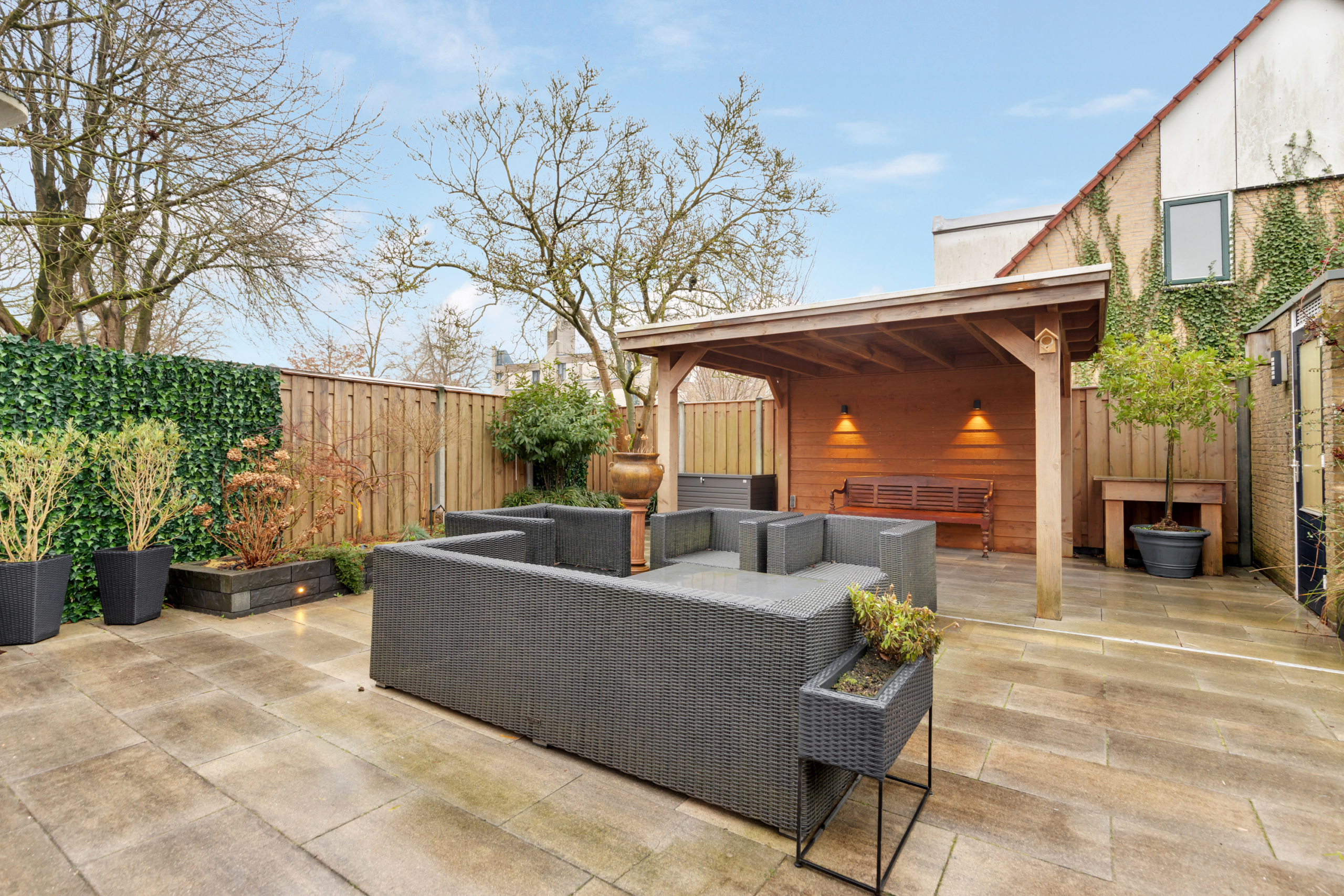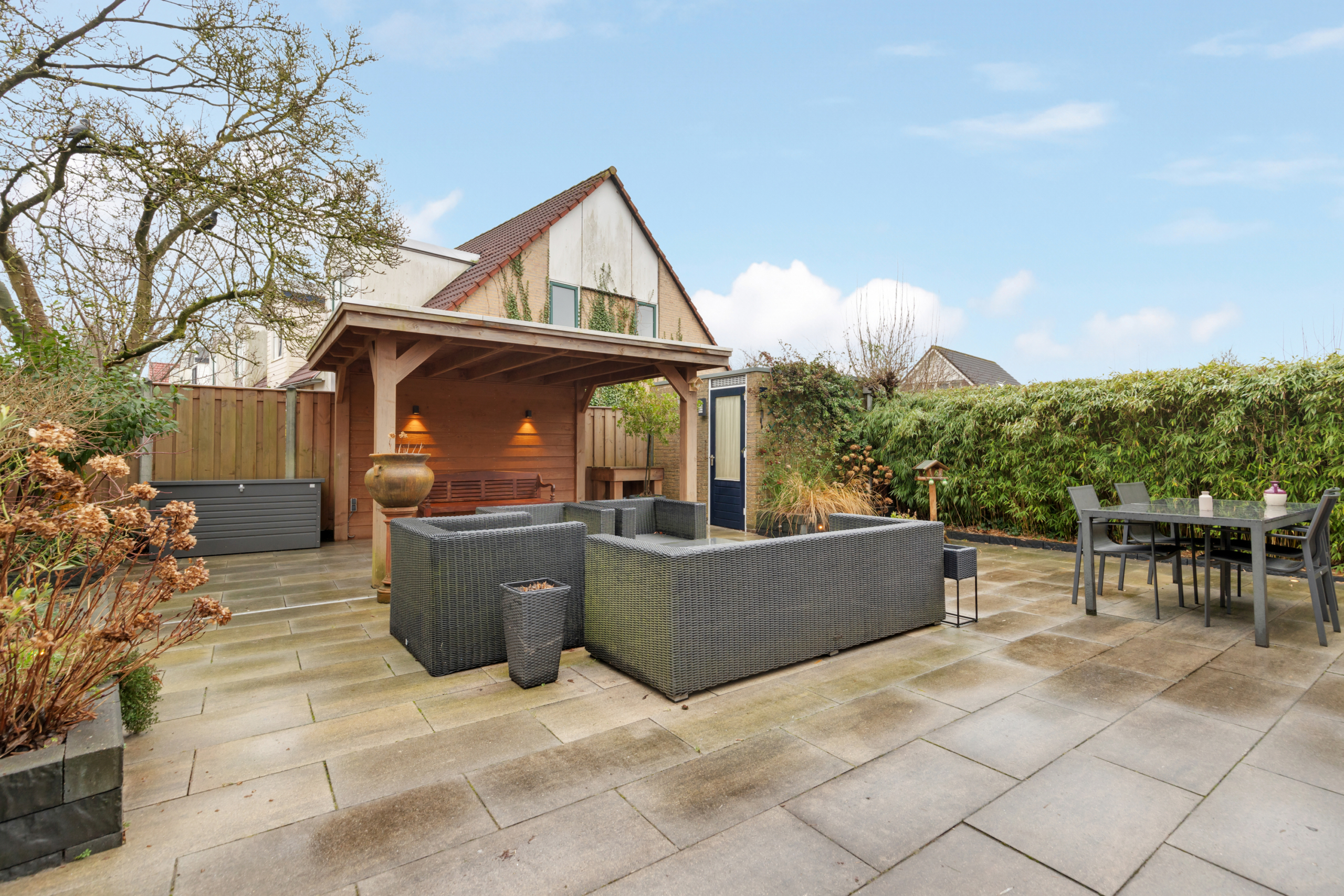 Via de achterdeur kom je in de ruime tuin op het zuiden waardoor er heerlijk veel zon is in de tuin gedurende de gehele dag. De tuin is fraai en onderhoudsarm aangelegd en volledig omheind met een afsluitbaar hekwerk, heeft een heerlijke veranda achter in de tuin en een schuurtje in de hoek. Via de zij ingang kom je zo bij de parkeerplekken. Handig voor het binnenbrengen van de weekboodschappen of het afvoeren van groenafval uit de tuin!