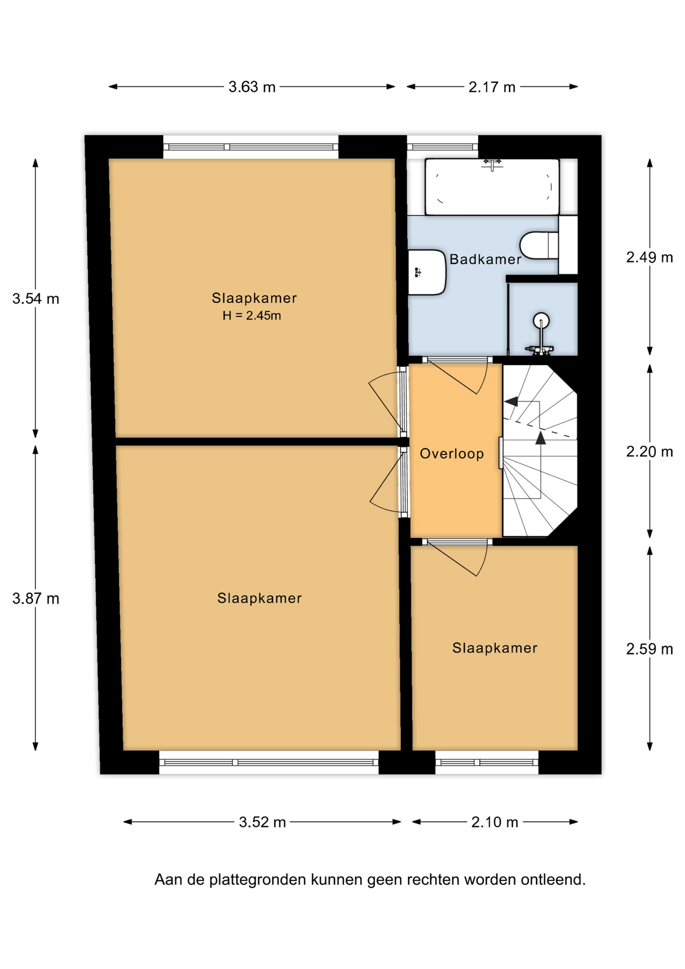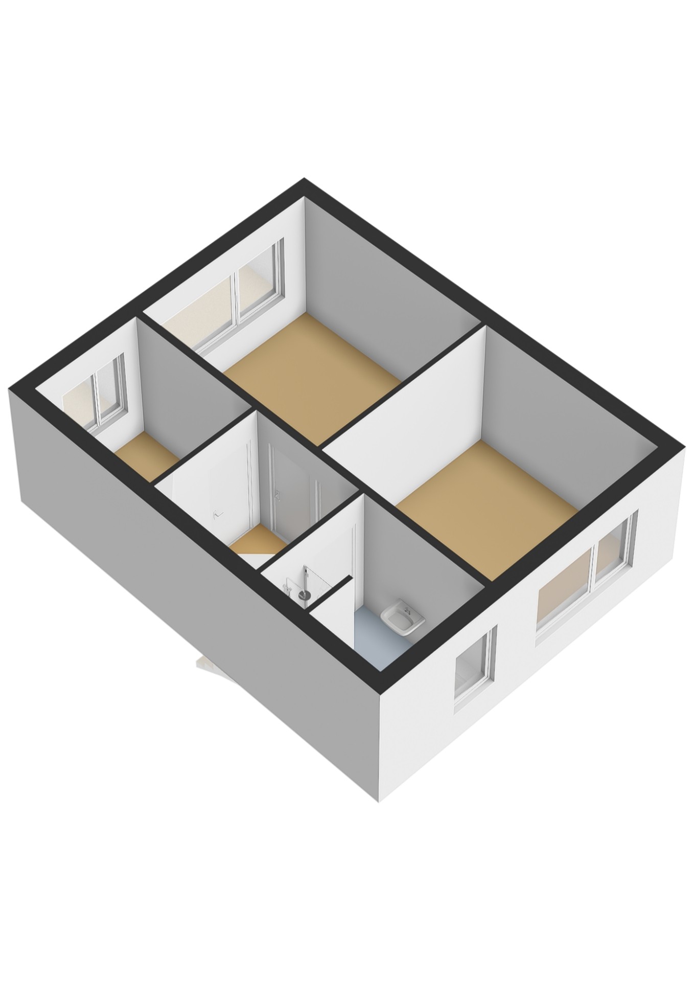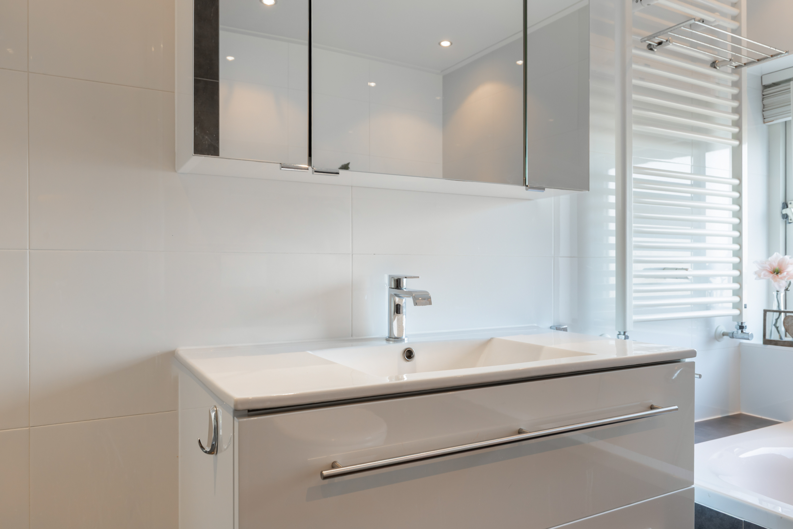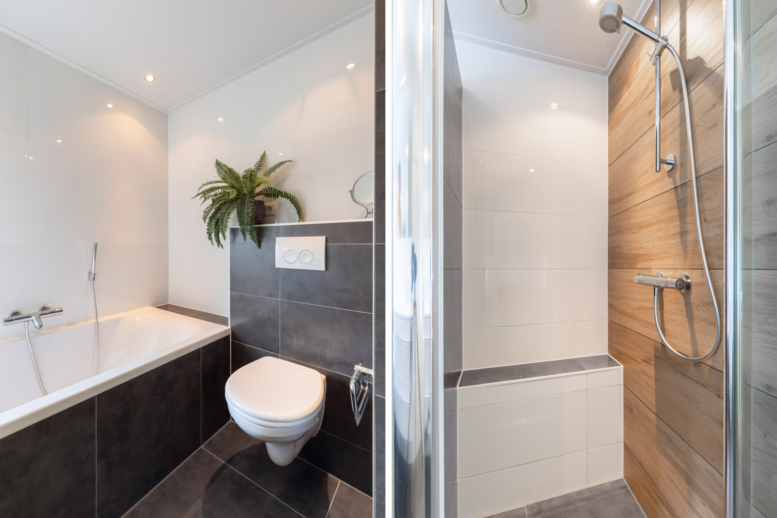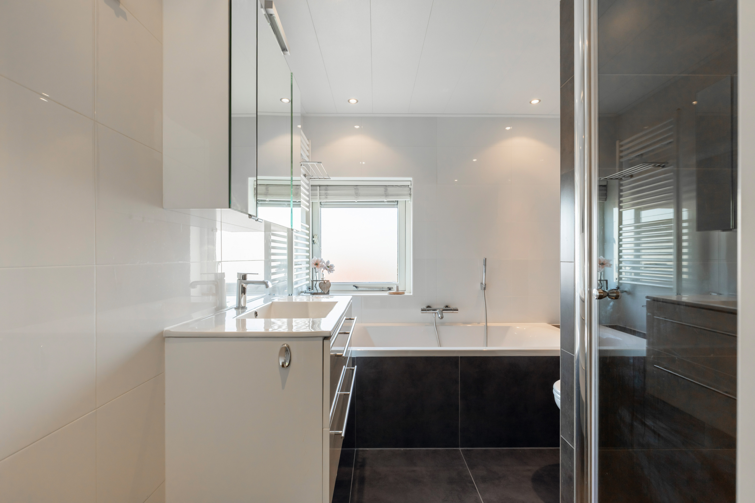 Eerste verdieping – overloop met 3 ruime slaapkamers. Twee daarvan aan de voorzijde en één aan de achterzijde van de woning. De badkamer is uitgevoerd in een moderne wit met grijze kleurstelling. Deze is ook volledig uitgerust met een ligbad en een inloopdouche, toilet en wastafel.