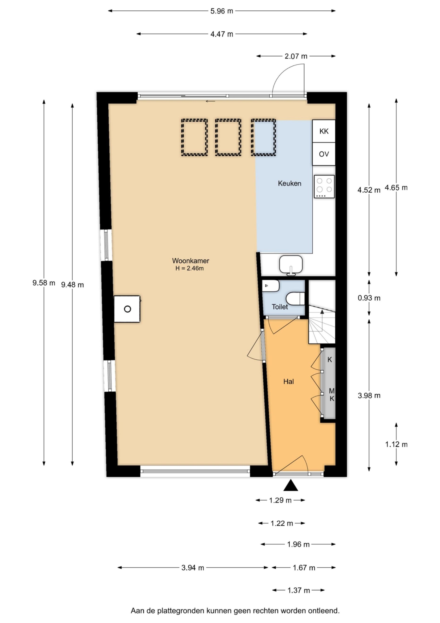 Begane grond – entree, gang met meterkast en toilet, trapopgang en doorgang naar de woonkamer met open keuken. De gehele benedenverdieping is voorzien van een pvc-vloer met deels vloerverwarming en een gezellige gashaard. Aan de achterzijde bevindt zich de open keuken met extra dakvensters in de uitbouw en een kunststof schuifpui. De keuken is voorzien van diverse inbouwapparatuur en heeft een frisse en moderne look.